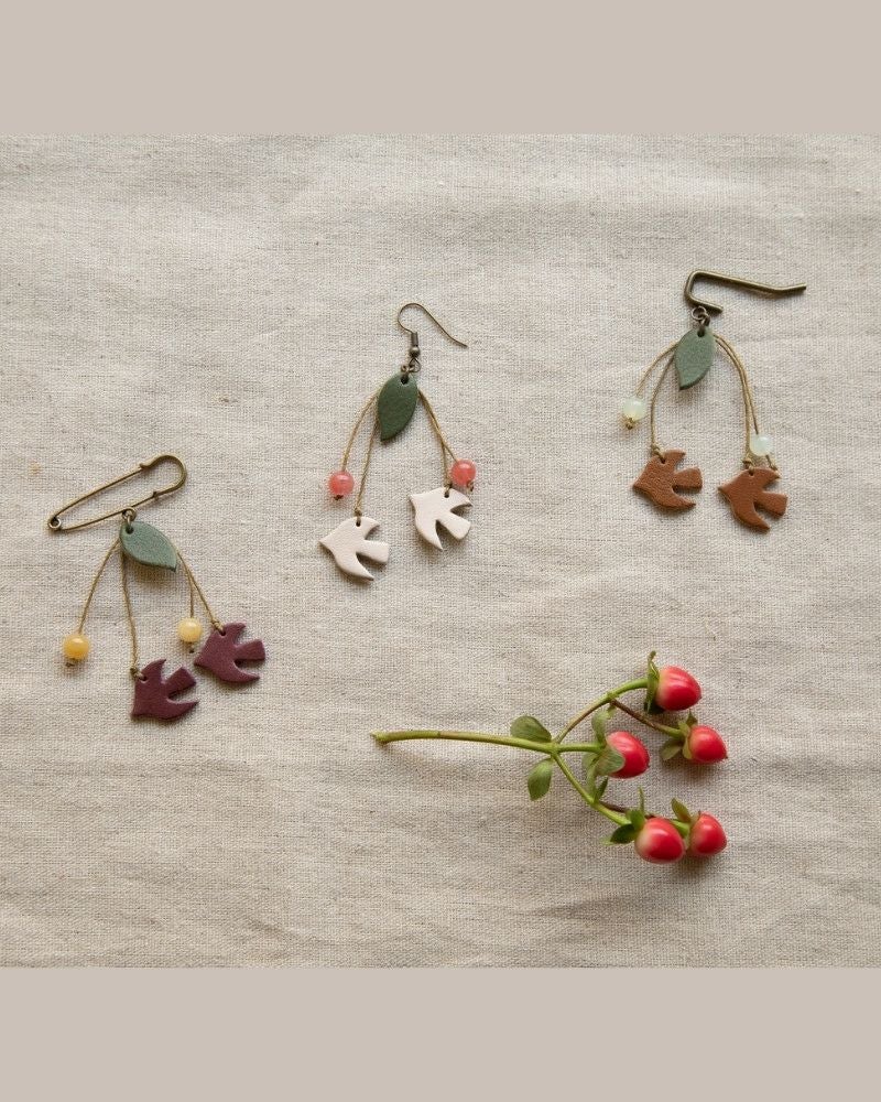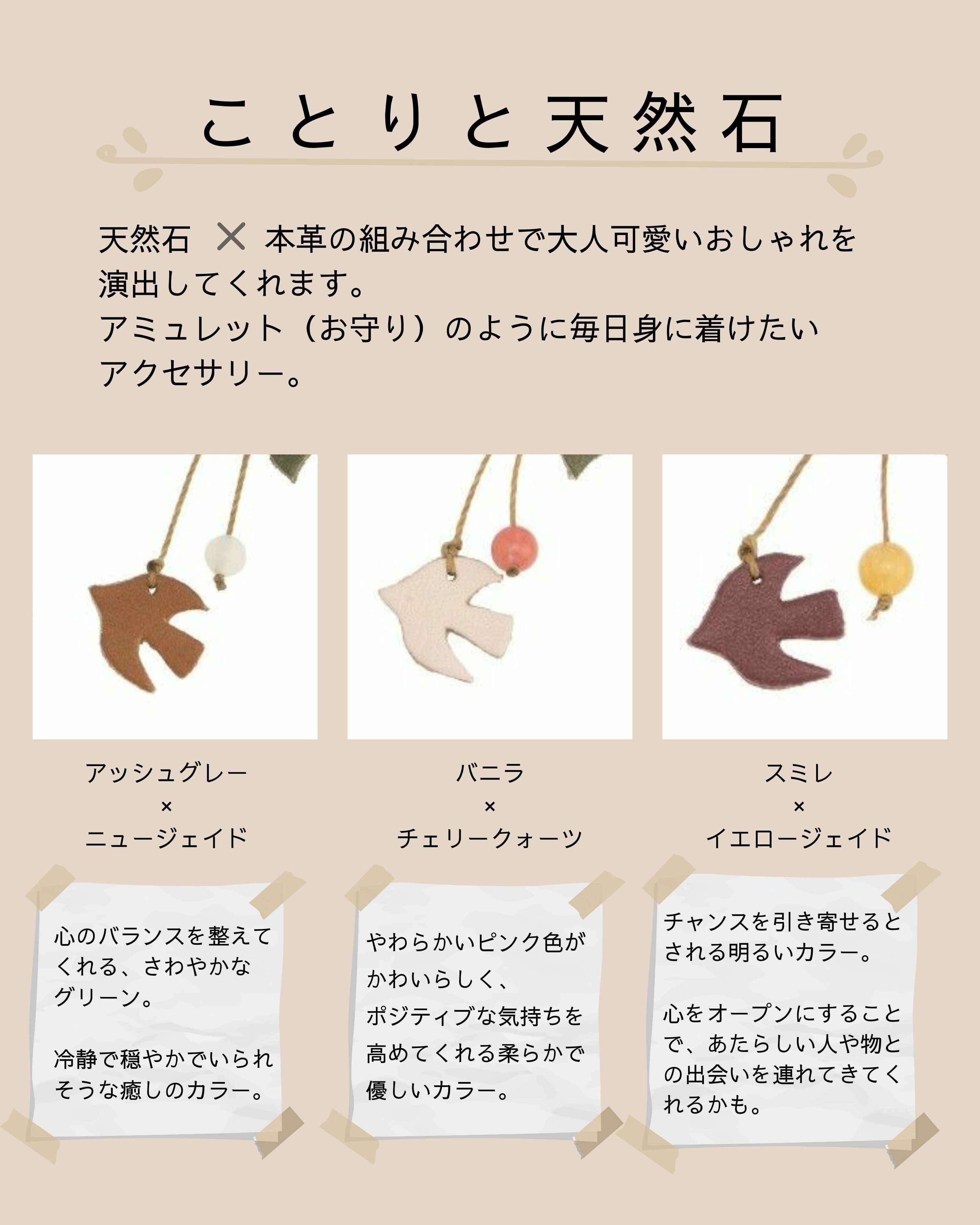 小さな小鳥のパーツは薄い革の方が型抜きしやすいけれど、少し厚みがある方がかわいらしいから、あえて厚めの革を選びました。 それぞれの本革の色に似合う天然石を探すのも、どきどきとして楽しい時間です。