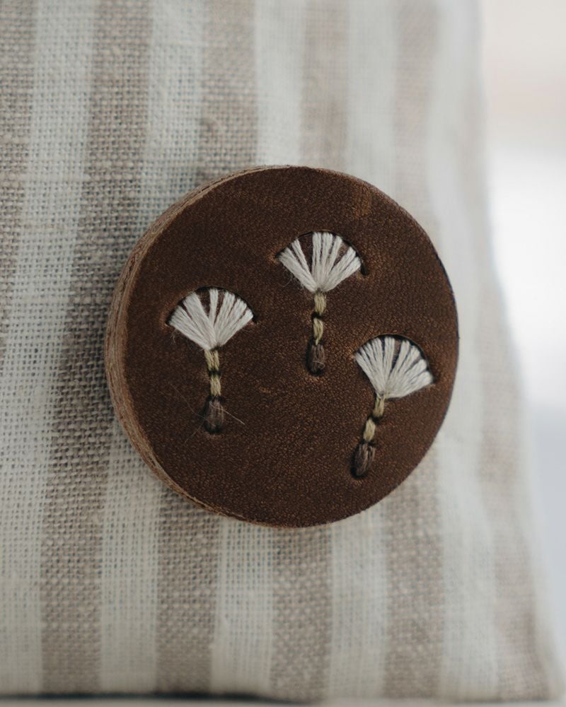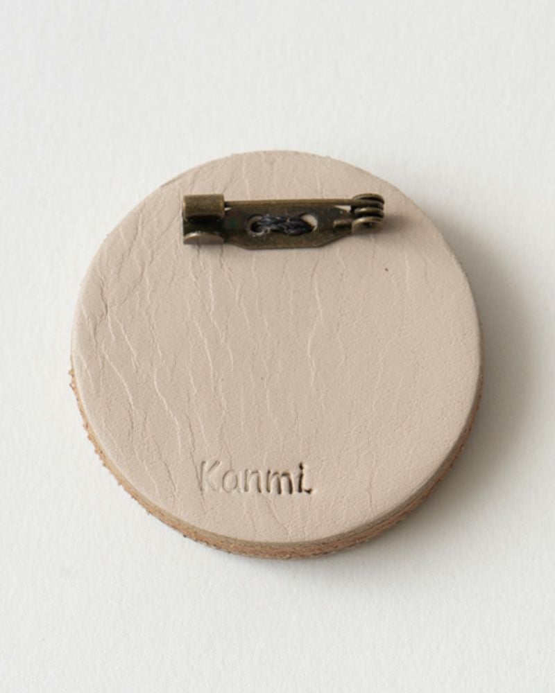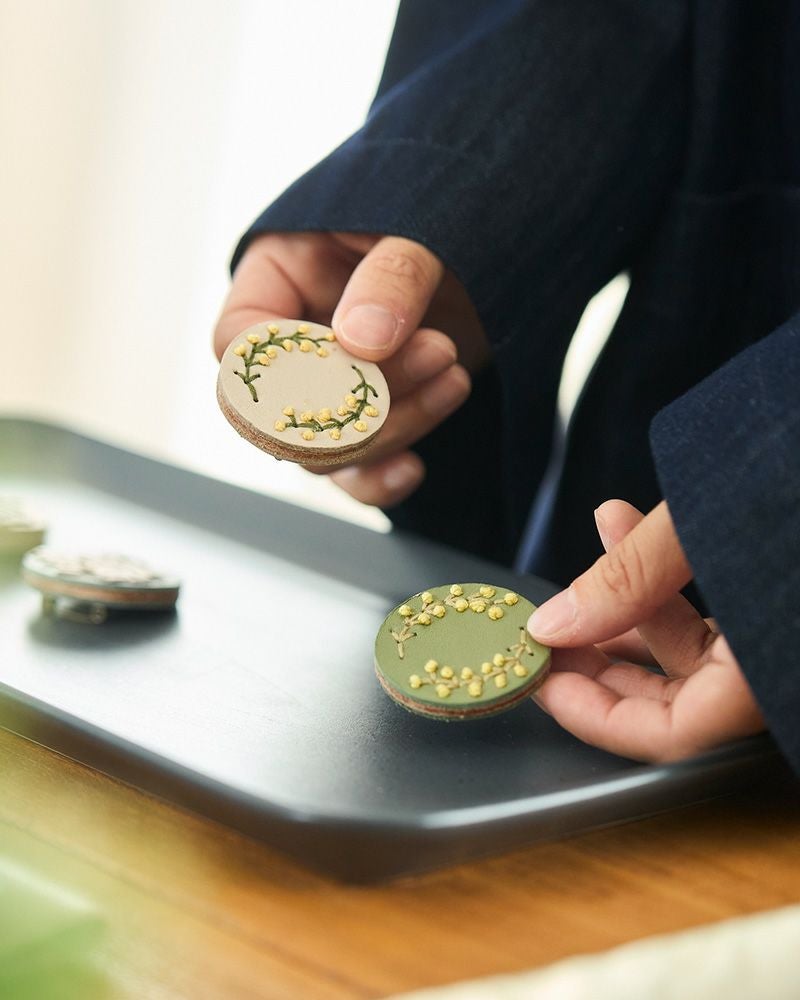 直径4センチと小さめだけれど、ぱっと目を引くのは色々なこだわりが詰まっているから。切り込みを入れた革に1本ずつ通していく手刺繍は、真ん中にボリュームをもたせる事でバラやたんぽぽ、わたげがぐっと引き立って見えるようになっています。表革と裏革の間にベージュ色の革をサンドしているので、横から見るとクリームが挟まったビスケットのよう。3枚の革を貼り合わせた事でうまれた、ぽってりしてした厚みもかわいらしさのひとつです。