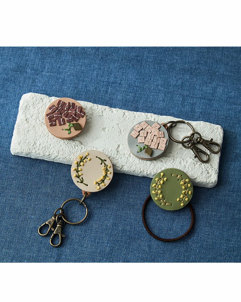 同じ刺繍と革を使ったアイテムは、ヘアゴム、ブローチ、キーリングの3種類。ヘアゴムとブローチなど、アイテム違いで同じ図案を集めればお揃いコーディネートが楽しめます。色や図案の組み合わせでナチュラルかわいくなったり、ニュアンスカラーで大人っぽい雰囲気にも。あなたのお気に入りの組み合わせを見つけてくださいね。