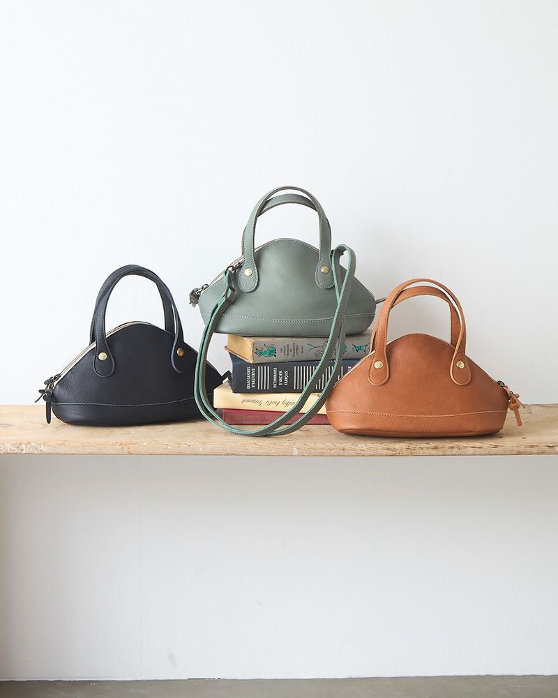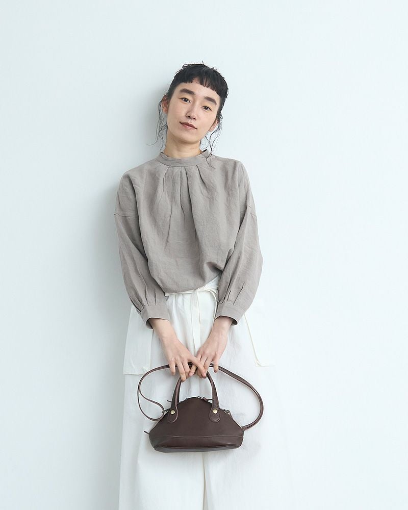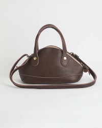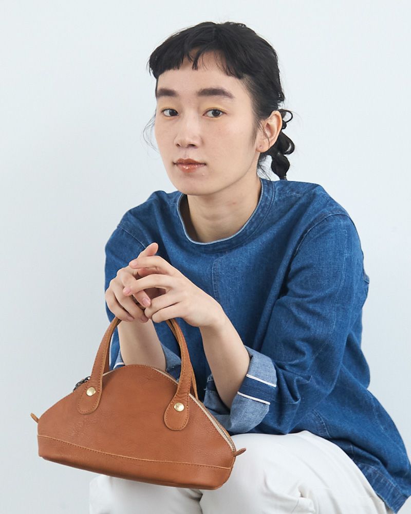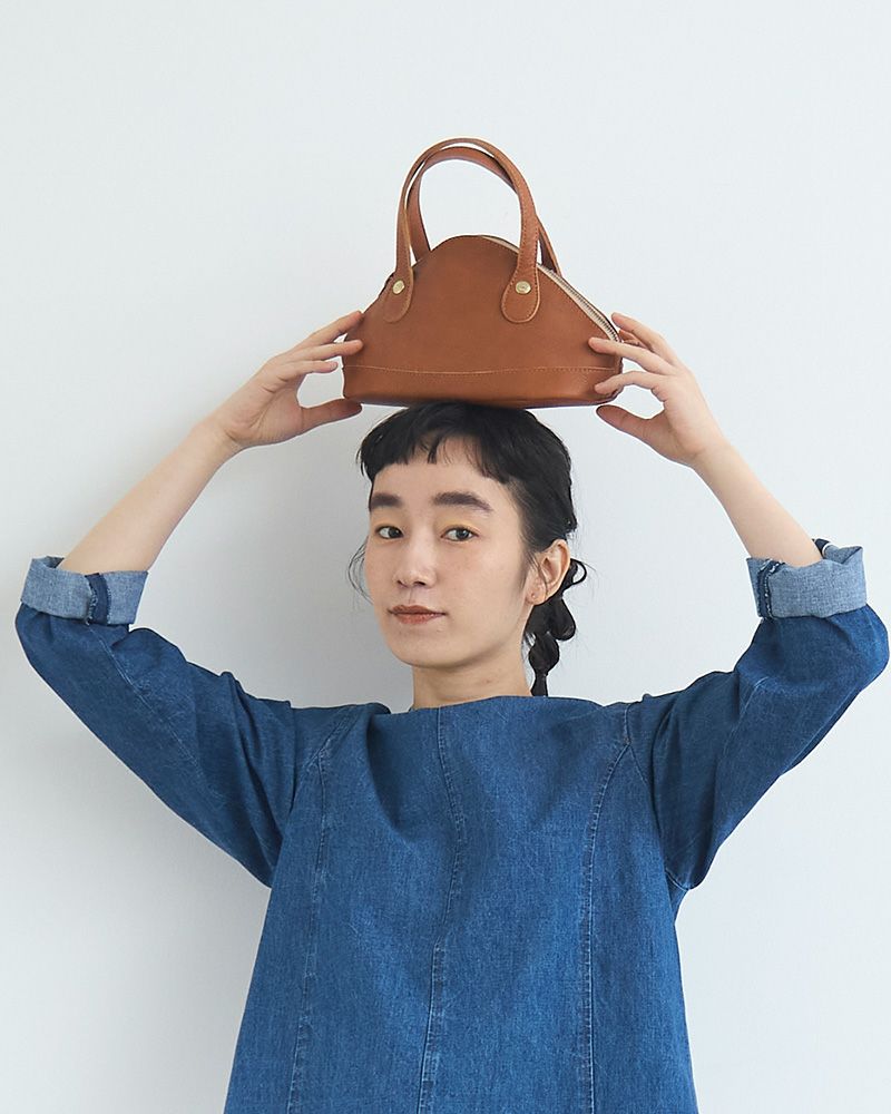 ファスナーが山のようにカーブして大きく開くシルエットが個性的。マッシュルームのように見えるので、「マッシュトートショルダーバッグ」と名づけました。部屋にかけて出番を待っている時も、存在感があるバッグです。