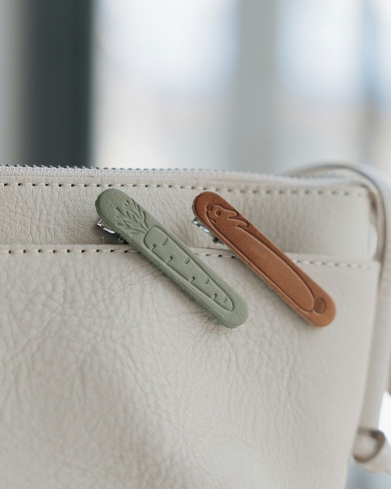 コートの襟もとやストールに挟んで、ブローチ代わりに。「うさぎ」と「にんじん」をセットでつけると、物語がはじまりそうで楽しい空想がふくらみます。色違いで2本並べれば、いつものコートが違った印象に。