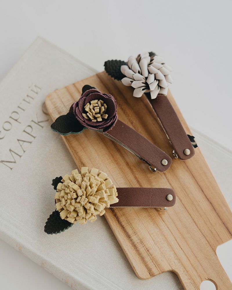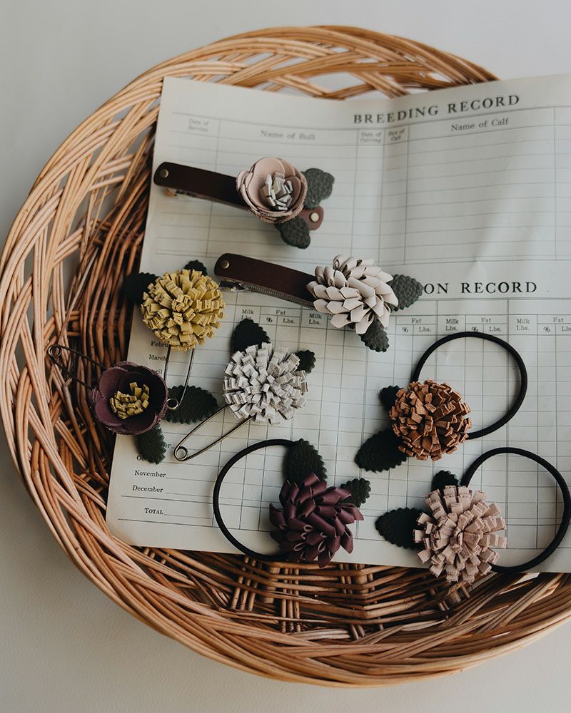 レザーフラワーシリーズは、ヘアゴム・ショールピン・バレッタの3種類。親子でのおそろいコーデも。ニュアンスカラーを組み合わせて優しいお花を日常に取り入れれば、こころもぱっと広がります。