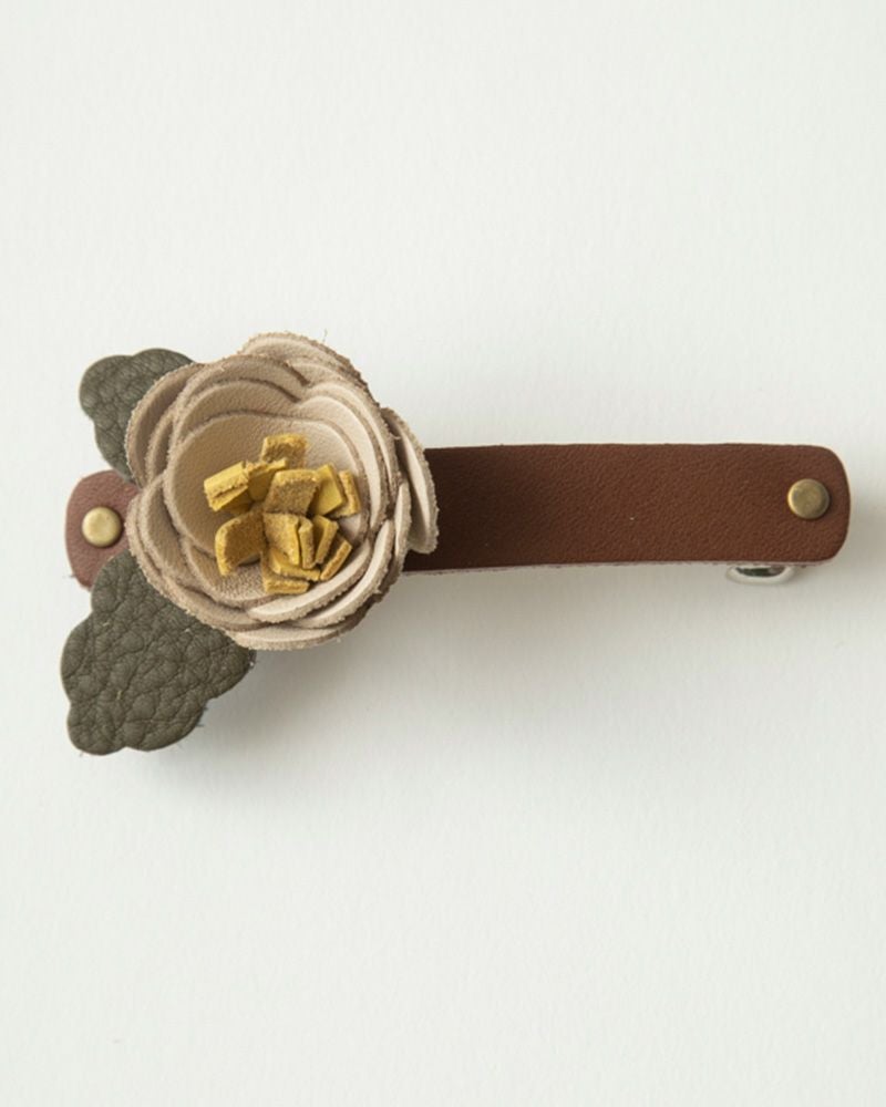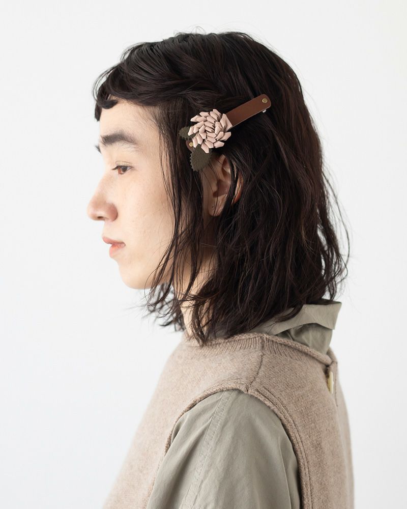 パチンととめるだけで上品な装いに。レザーフラワーバレッタ 簡単にヘアアレンジ「レザーフラワー バレッタ」