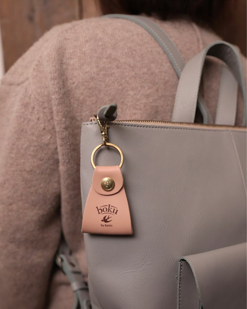 アクセントになっているのは、Kanmi.オリジナルの真鍮カシメ。ちょこんと揺れるタグが鍵の動きに合わせて揺れ、全体にやわらかい遊び心と“らしさ”を添えています。日々のアイテムに、ちょっとだけ気分が上がるような装飾を。