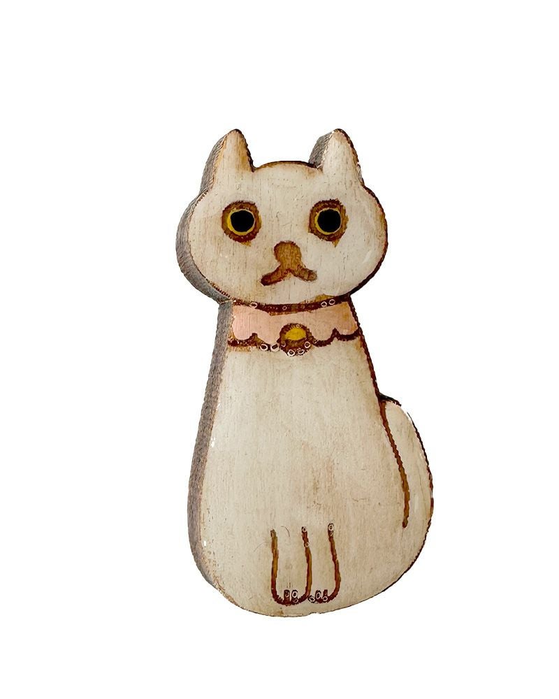 Kanmi.の愛すべき猫たち、ごま・もも・どらやきが木のブローチになりました。メープルの木をレーザーで焦がして絵を付けて、やわらかい色味をつけ、つるつる質感の樹脂でコーティング。あたたかみのある木の質感とゆるい表情がなんとも癒し系なブローチです。