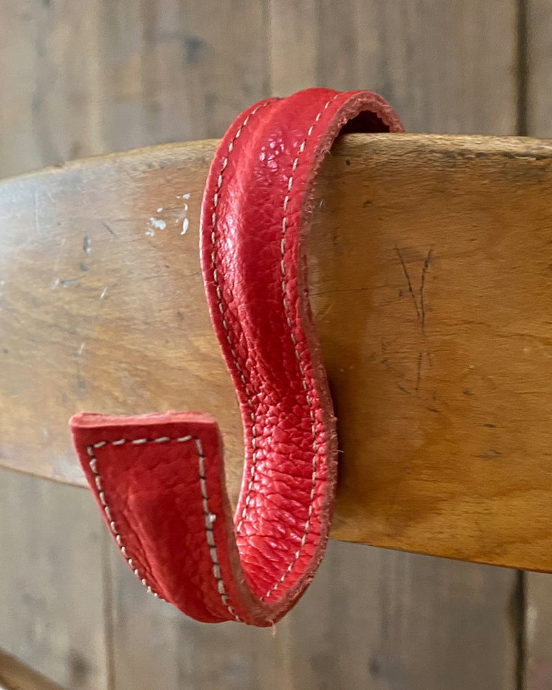 本革を使ったフリーフックです。お好きな形に曲げられるので、使用する場所や引っかけたい物に合わせてご使用ください。S字フックの要領で、バッグや帽子などを見せて収納するのはもちろん、ひとつカバンに入れておいて、お出かけ先での荷物掛けとしても。Kanmi.のSHOPでも、商品ディスプレイで大活躍している、縁の下の力持ちです。