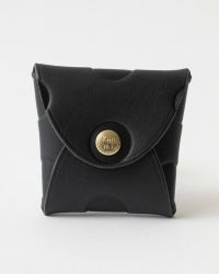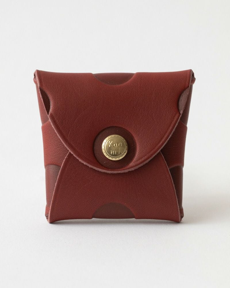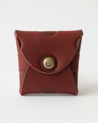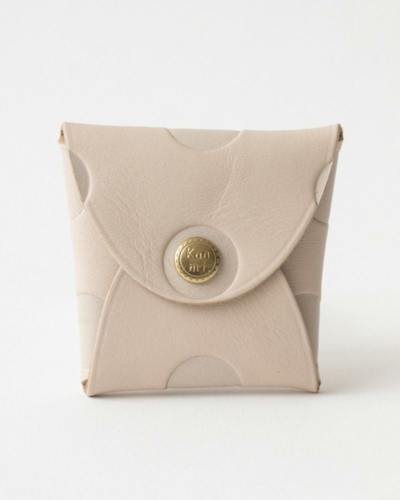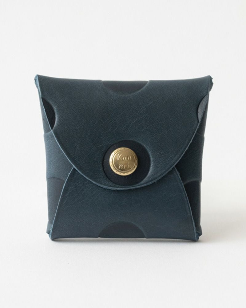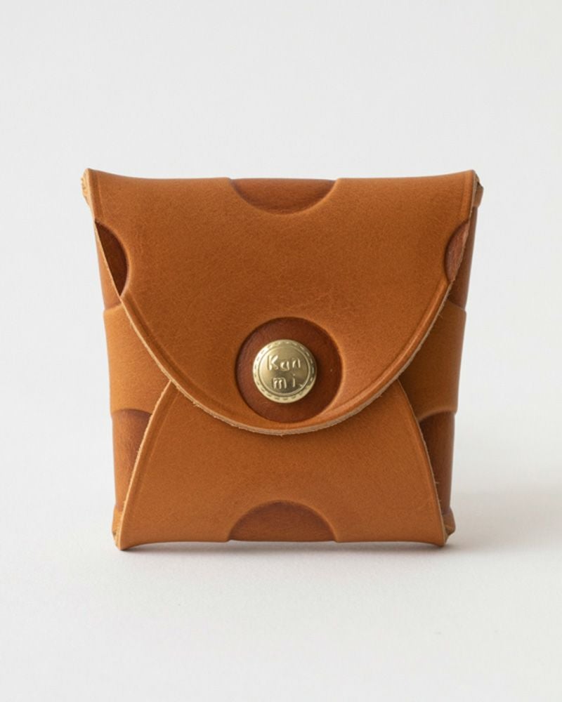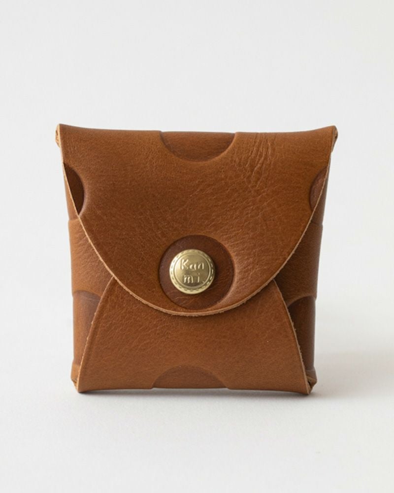 一枚革の左右と下を織り込んで、どこも縫わずに真鍮ボタンで止めた封筒のような小銭入れ。ボタンに押されたKanmi.のロゴがワンポイントに。手のひらにすっぽりおさまるコンパクトさが、愛着を感じさせてくれます。底の幅が少し狭くなっていて、ささっと左右に揺らすとコインが手前に出てきます。蓋にコインを広げれば、中身が見えやすく支払いもスムーズ。
