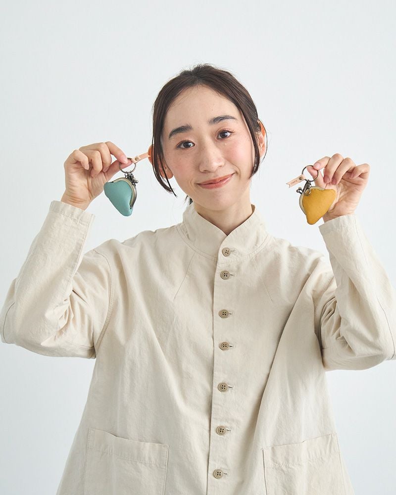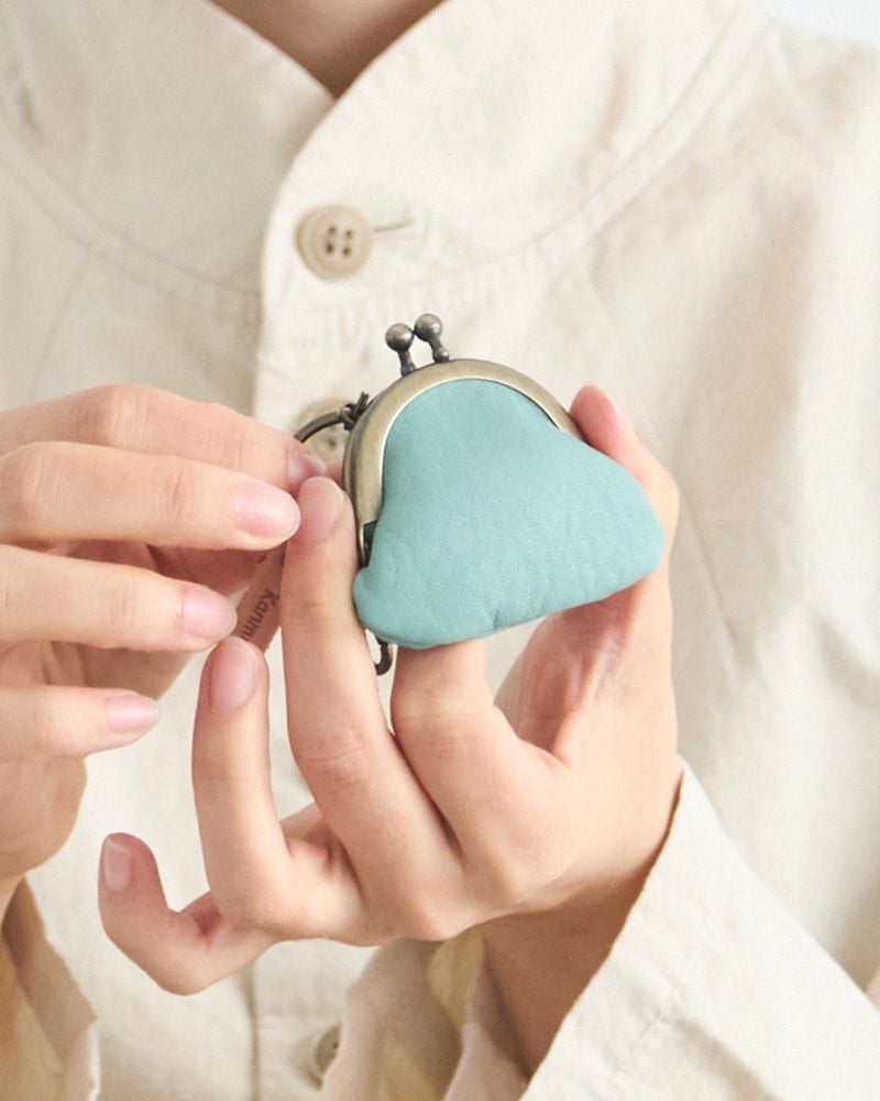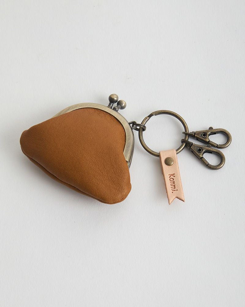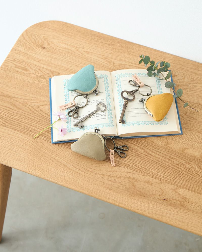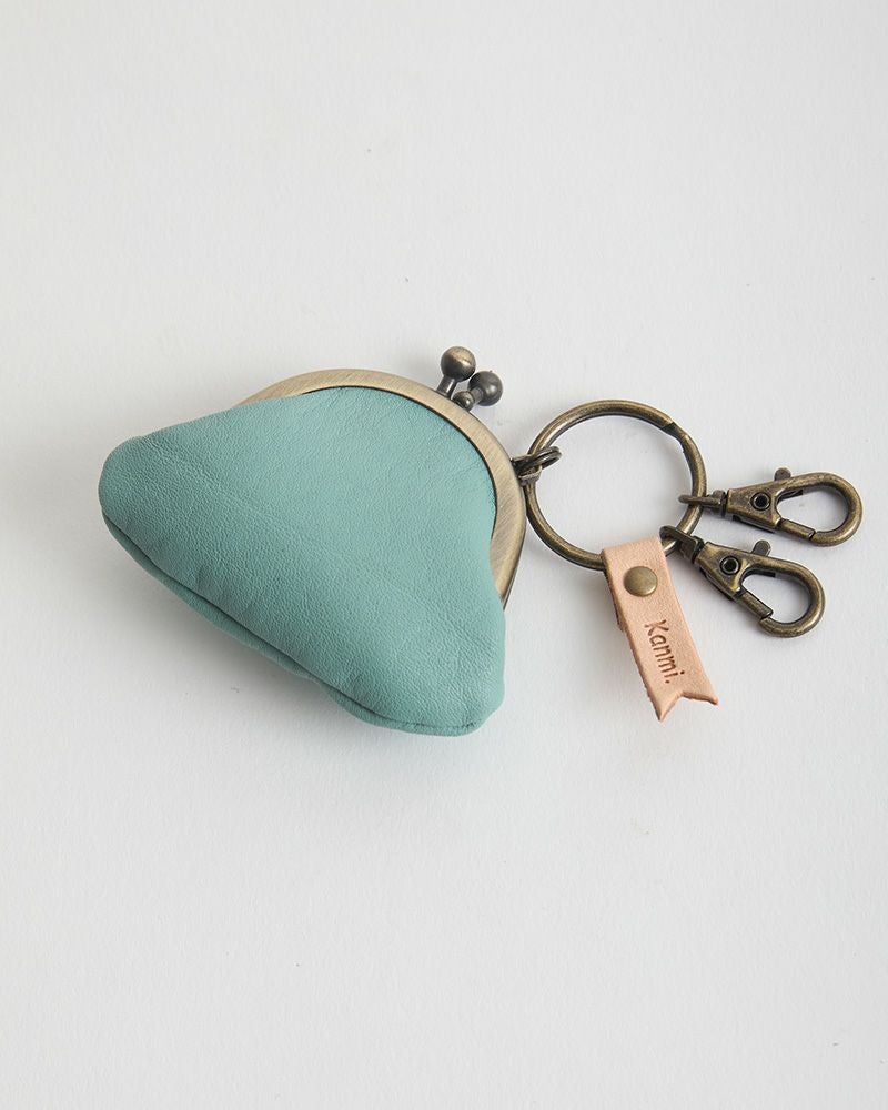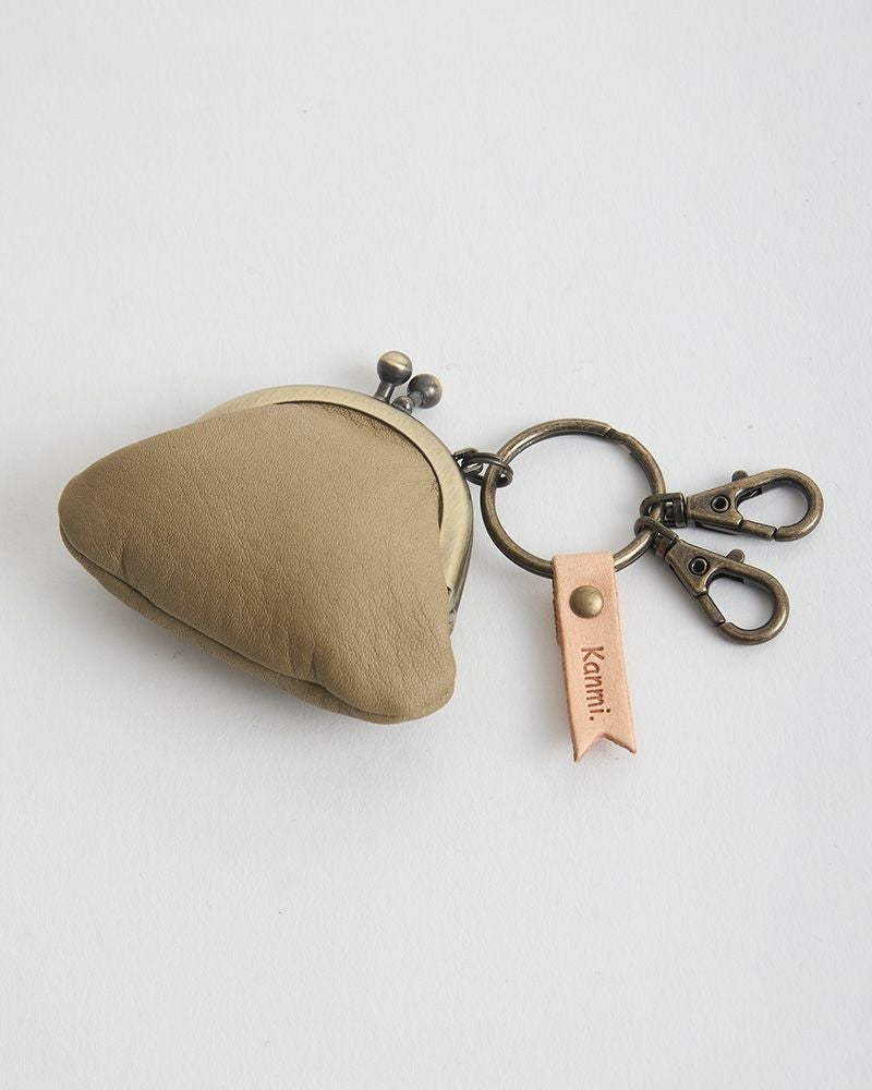キーリングとがま口のアンティークゴールドが、パステルカラーの革色を引き締めて小さいけれど存在感もあります。キーリングについたフラッグ型の飾りにはKanmi.のロゴが。小さな部分まで気持ちのこもった、ちいさながま口。色合い、手触りにあなたの優しい気持ちを加えてプレゼントしてはいかがですか。