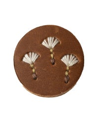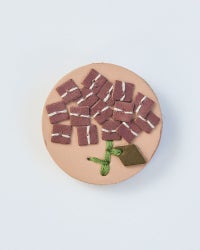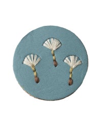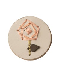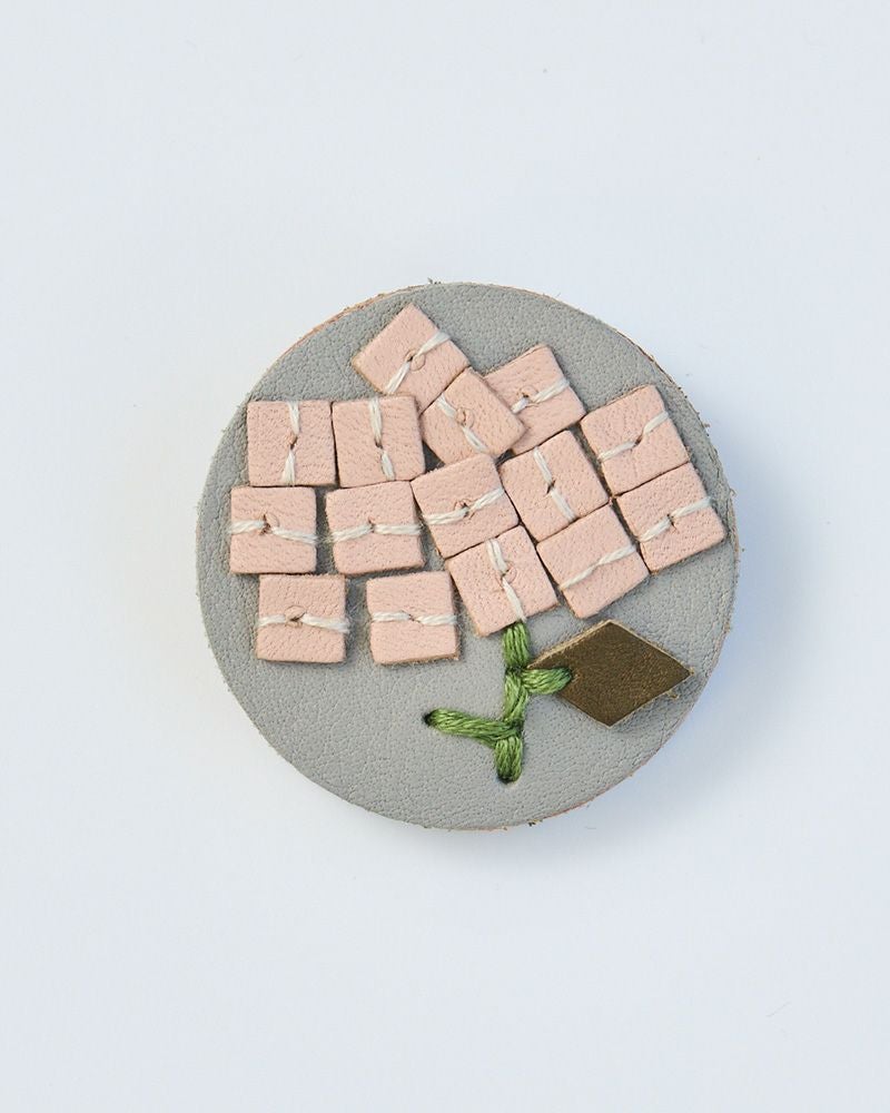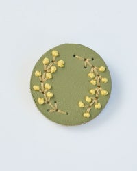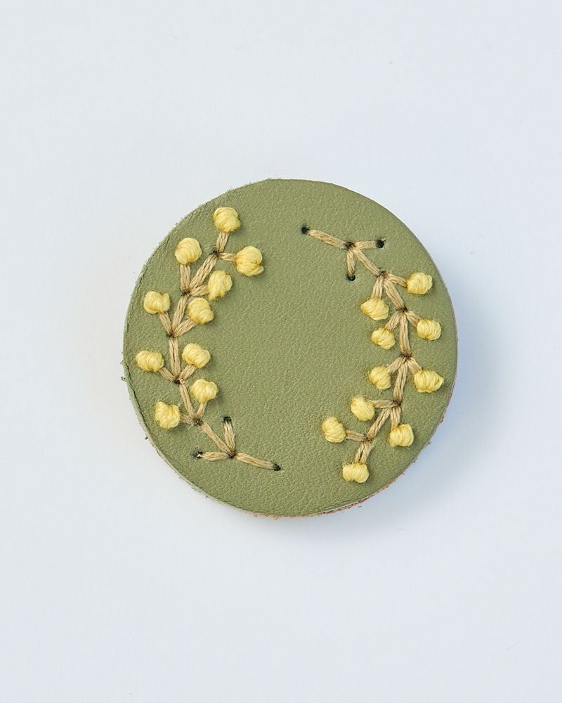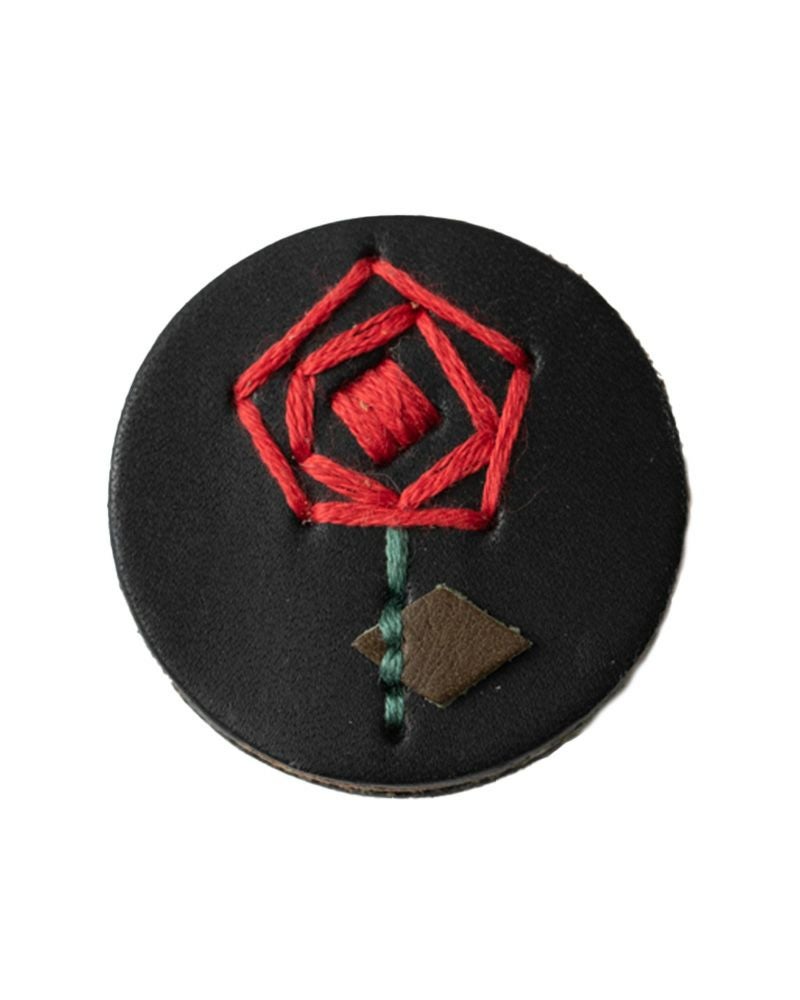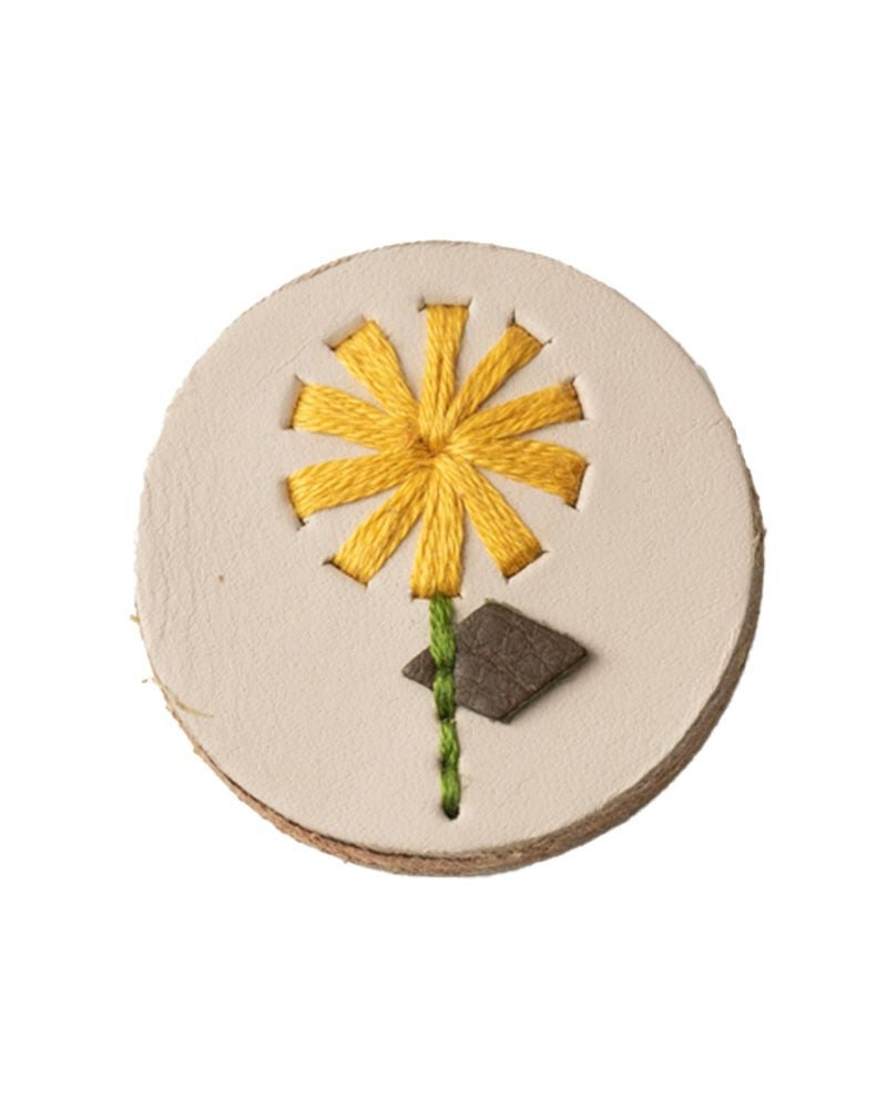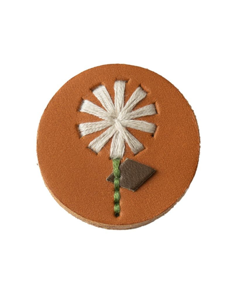 直径4センチと小さめだけれど、ぱっと目を引くのは色々なこだわりが詰まっているから。切り込みを入れた革に1本ずつ通していく手刺繍は、真ん中にボリュームをもたせる事でバラやたんぽぽ、わたげがぐっと引き立って見えるようになっています。表革と裏革の間にベージュ色の革をサンドしているので、横から見るとクリームが挟まったビスケットのよう。3枚の革を貼り合わせた事でうまれた、ぽってりしてした厚みもかわいらしさのひとつです。