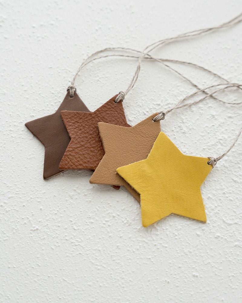 全部で3パターンあるオーナメントですが、全種類にお星さまがはいっています。 お星さまの色と革は、たくさんバリエーションを作りました。「何色が届くかな?」と届くまでのドキドキもぜひお楽しみくださいね