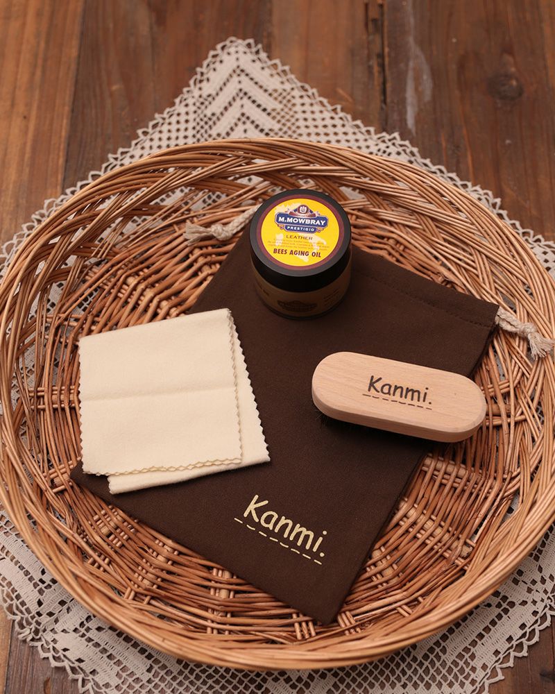 ビーエイジングオイル、馬毛ブラシ、クロスをまとめて収納できるKanmiオリジナル巾着付き。使いたいときにさっと取り出せて、使い終わったらそのまましまえるため、革のお手入れが特別な作業になりません。道具をひとつにまとめることで、革と長く付き合うための準備が自然と整います。