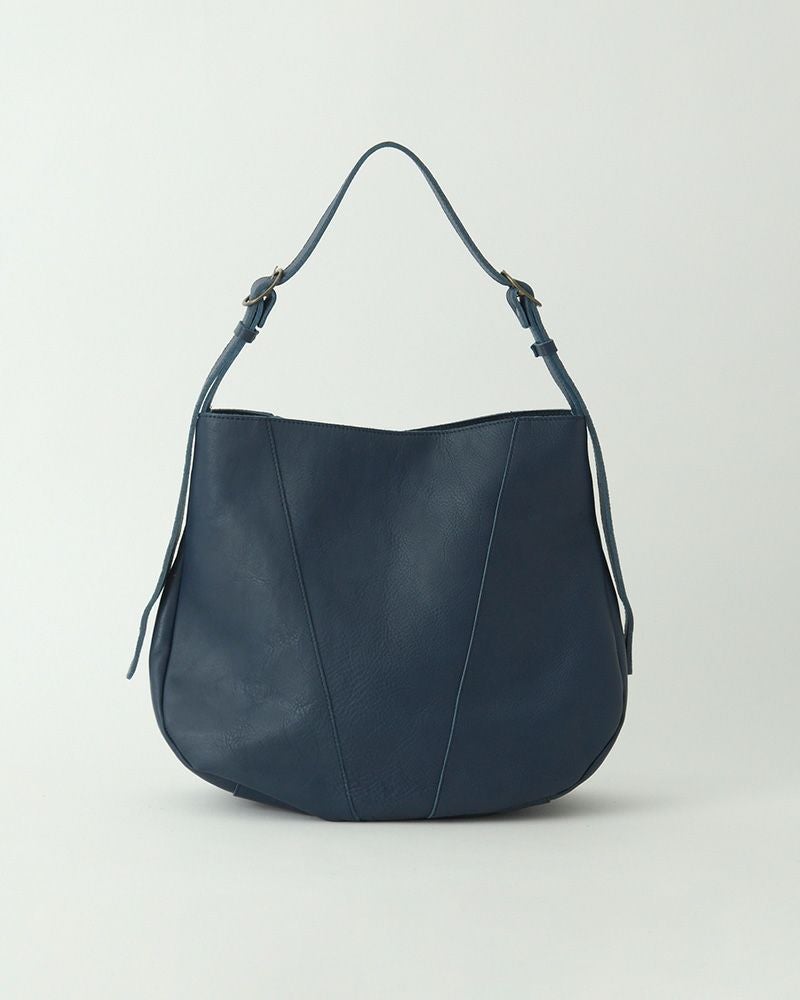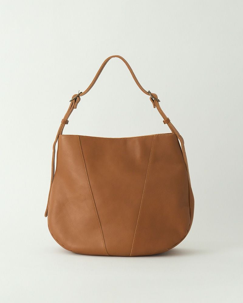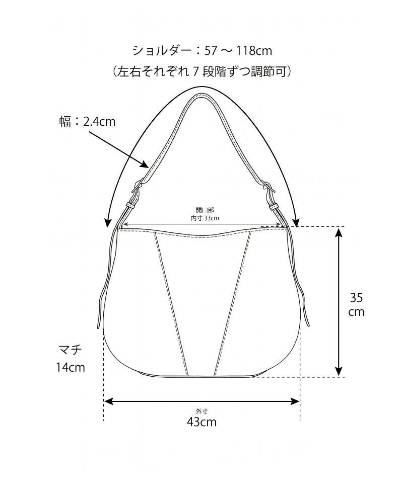 愛着がわいてくる丸みのある“しもぶくれ”が特徴の、大きめショルダー。一番ふくらんだ部分が43cmとたっぷり大きめなので、A4ファイルやノートPC、長財布やポーチ、ペットボトルもしっかり入ります。底マチが14cmあるので荷物の整理がしやすく、見た目以上の収納力にびっくり。荷物が重い日でも、あなたにやさしく寄り添ってくれます。