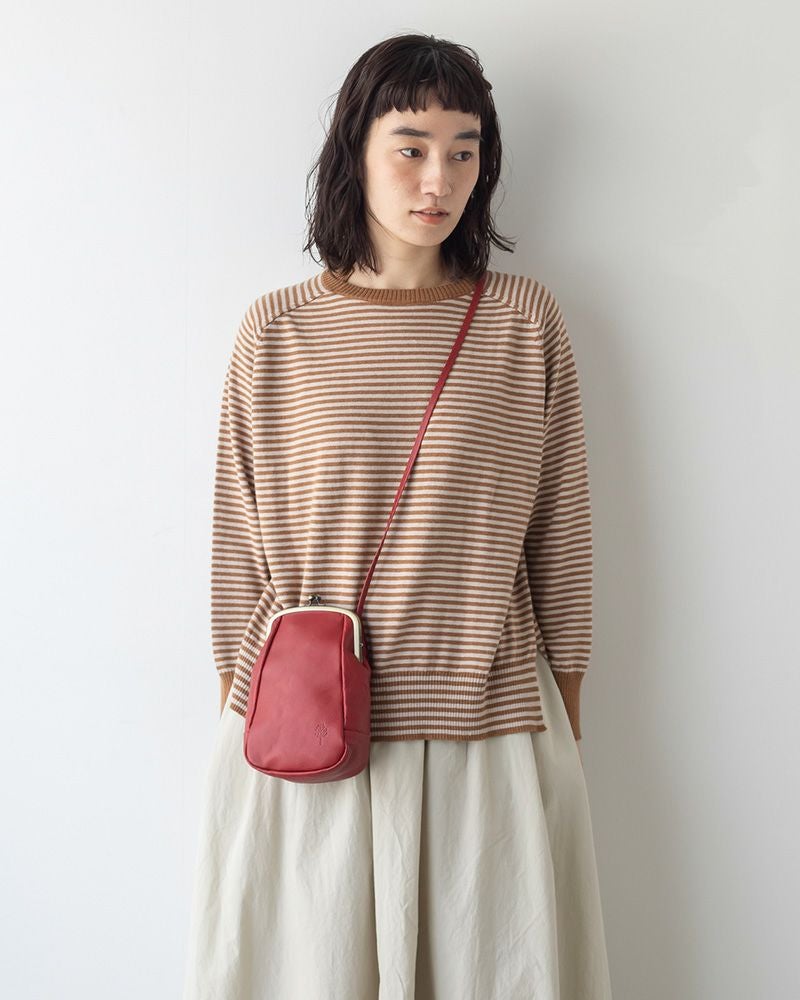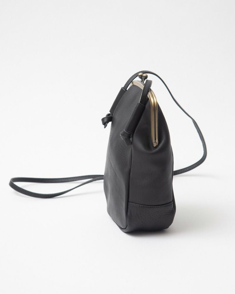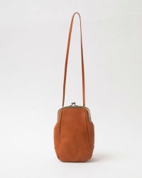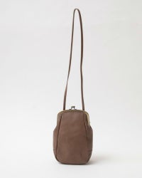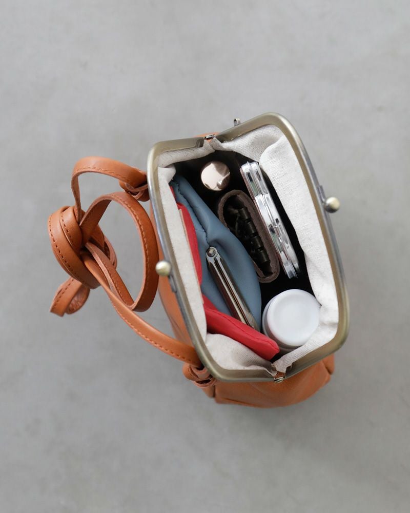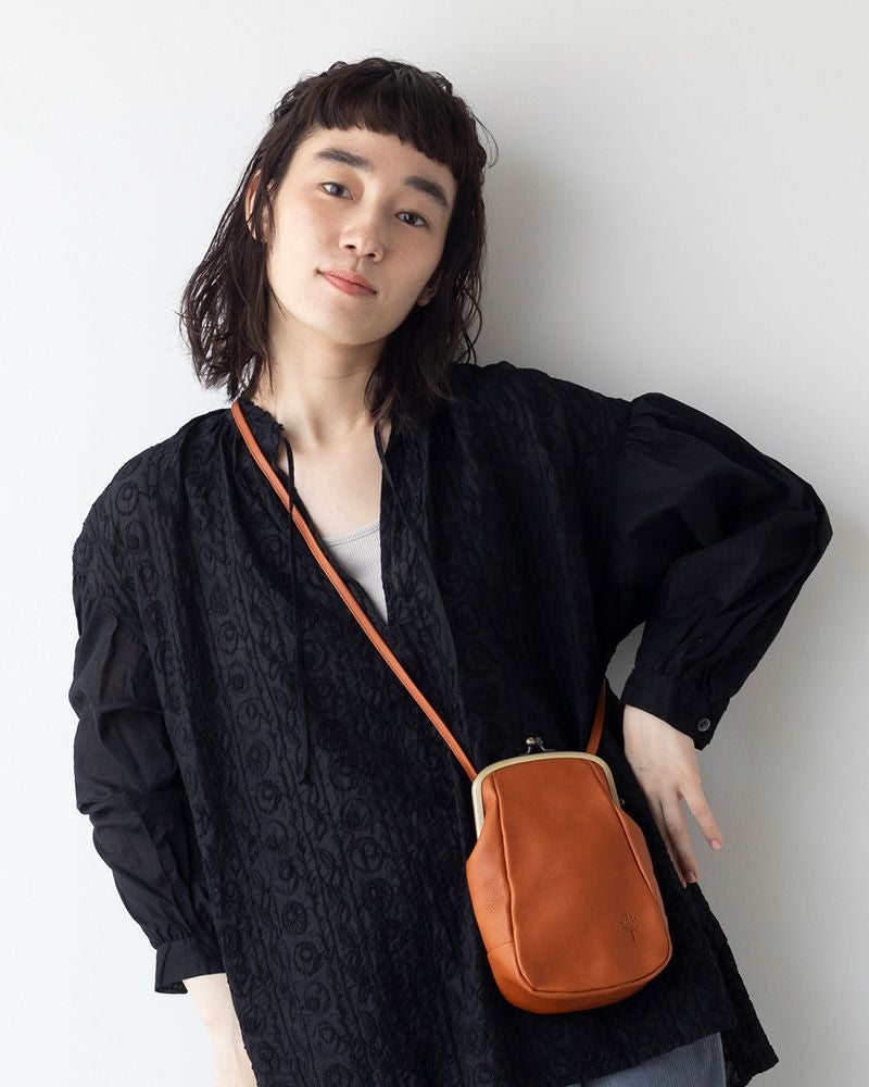ちょこんと飛び出したショルダー紐を通すベロが、お耳みたいで愛らしい。ぱっと見た時はシンプルに見えるけれど、がま口の金具やショルダー用のお耳が、静かに個性を主張してくれる絶妙なバランスのポシェット。