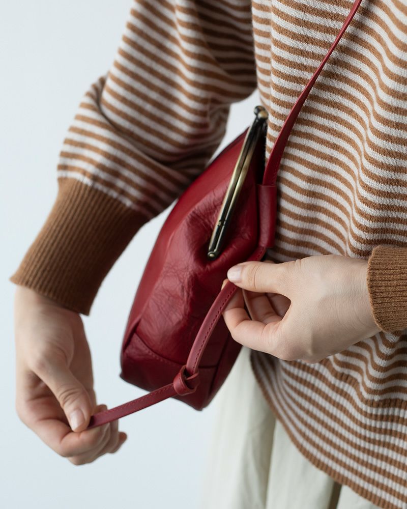 結び目を変えて長さを調節できる細いショルダーストラップ。斜めがけすると、華奢で女性らしい印象を与えてくれます。 シンプルなパンツスタイルと組み合わせると、繊細さと個性が少し加わって全身のバランスを少しだけ変えてくれます。さりげない個性を足してしてくれるけれど主張しすぎない、こだわりを感じさせるポシェットです。