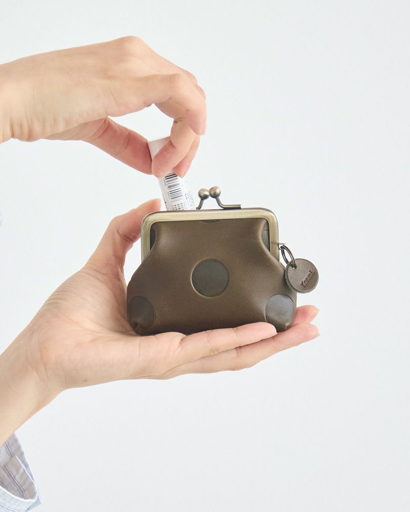 底マチが2センチあり、手の中に収まる小さめサイズ。キャンディの柄とおそろいの、丸い革タグがかわいさを引き立てています。見ているだけで気持ちが弾む、いつも一緒にいたくなるがま口です。