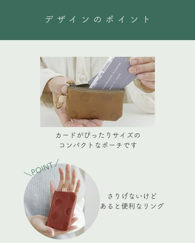 大人可愛い水玉模様と、しっとり手になじむ上質な牛革。シンプルで使いやすく、毎日持ちたくなるポーチです。全13色の中から、自分らしさに合うひとつを選ぶ楽しみも。バッグの中にそっと彩りと、ときめきを添えてくれます。