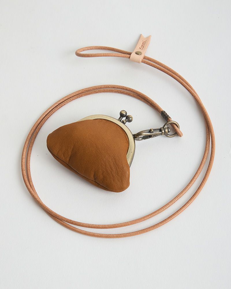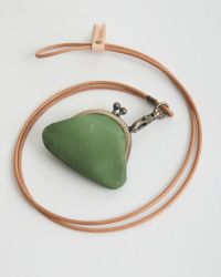 丸革ひもに付いたフラッグ型のパーツで長さが調節できる、首から下げられるフカフカのこがま口。やさしい手ざわりで小さく軽いのも使いやすいポイント。ファッションのアクセントとしても目をひきます。