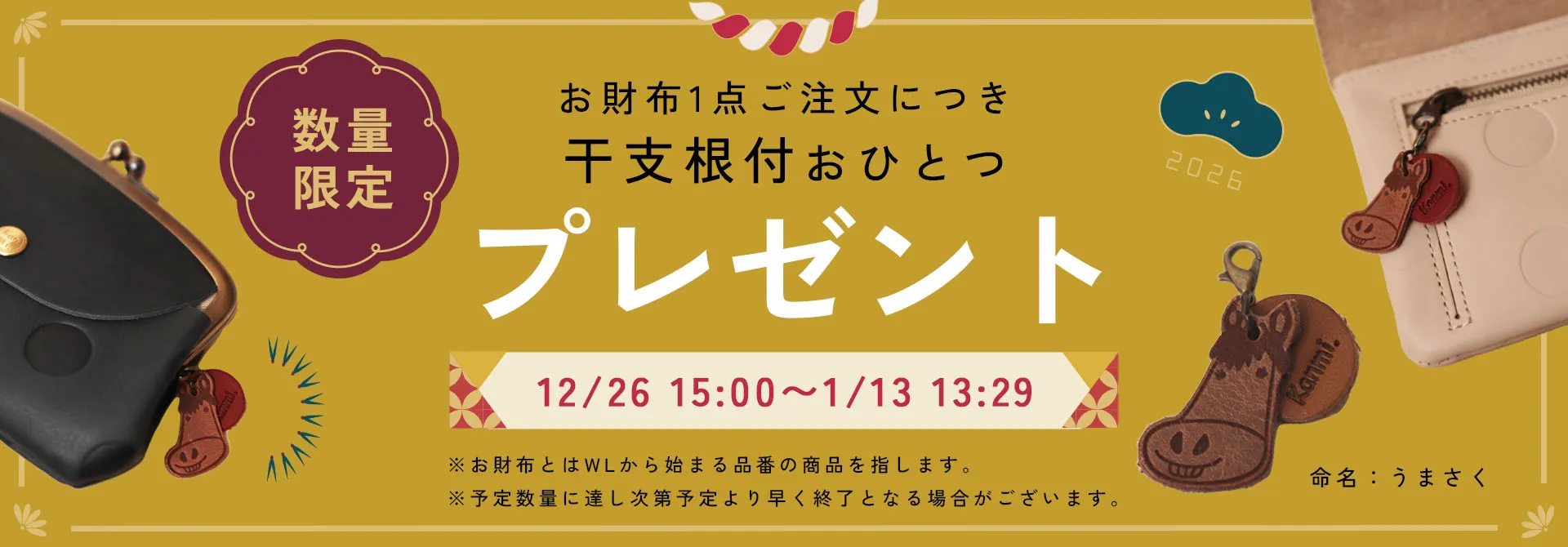 12月26日15時より公式オンラインストア&実店舗にてノベルティフェアを開催いたします。期間中、お財布をご買い上げ頂いた方全員に、お財布1点につき一つずつ、オリジナル根付をプレゼント!