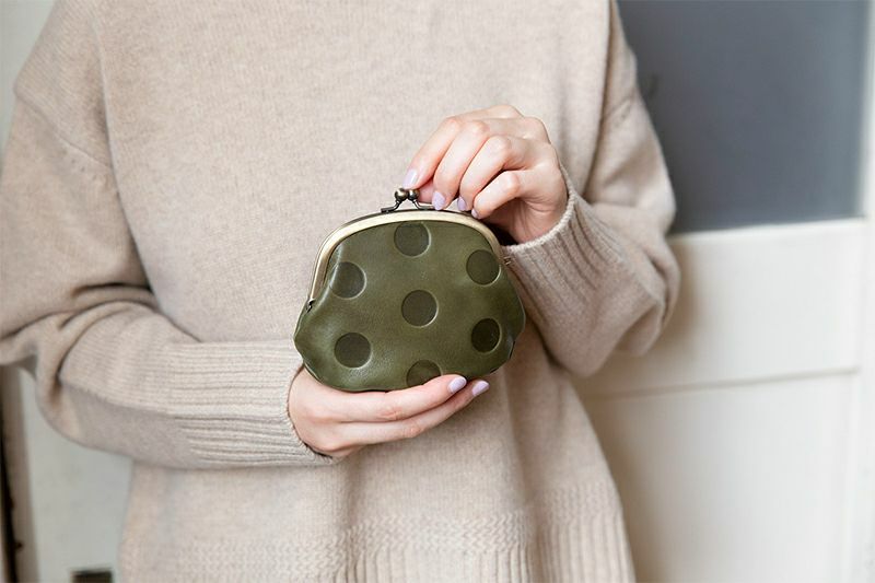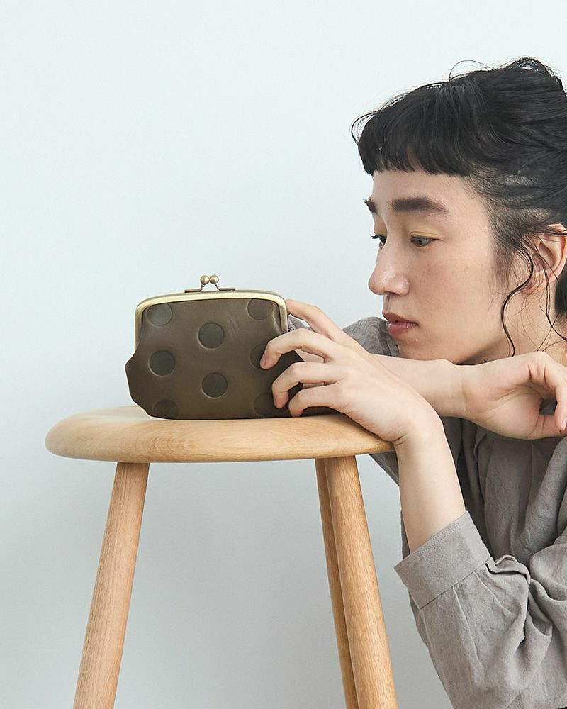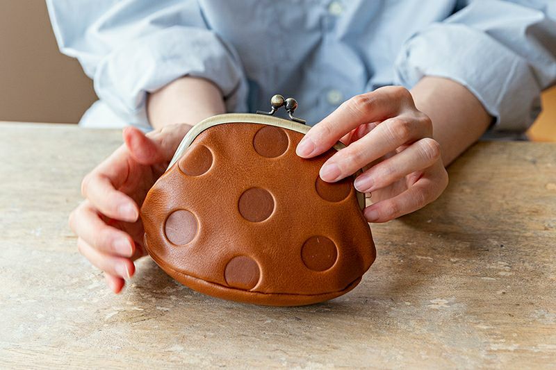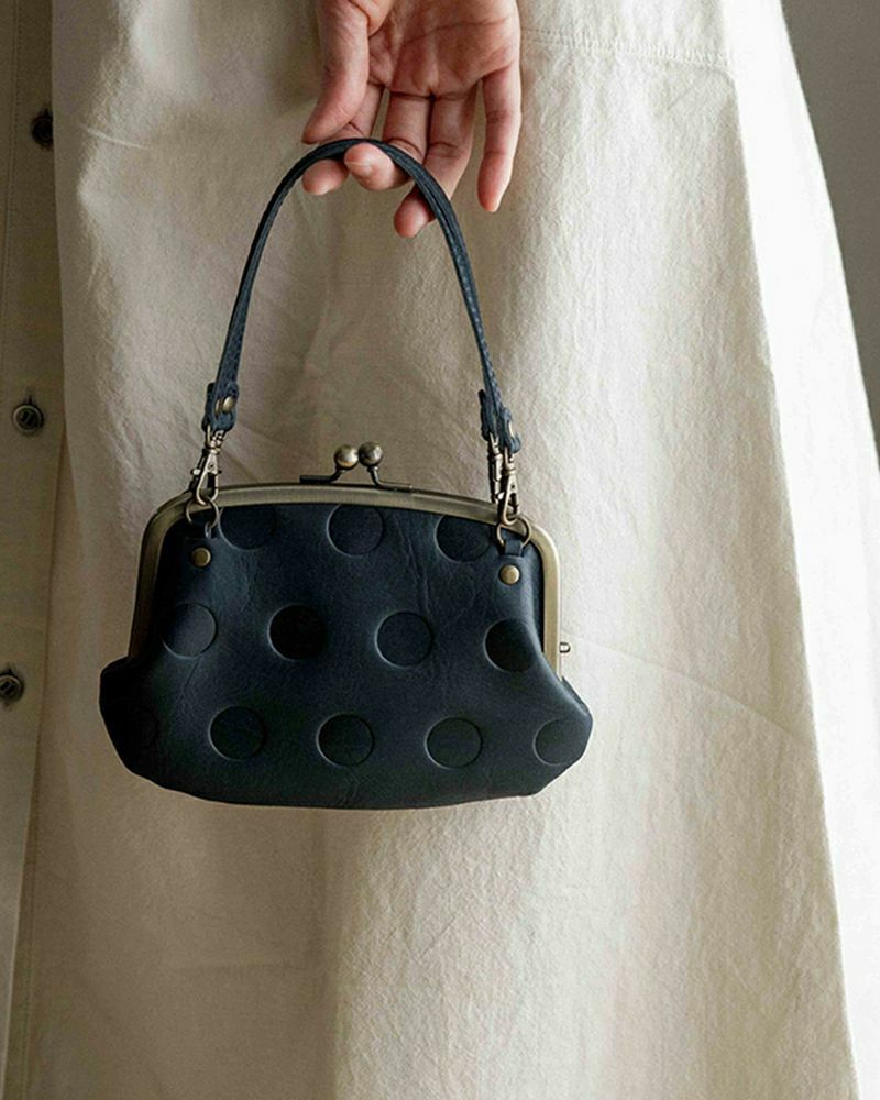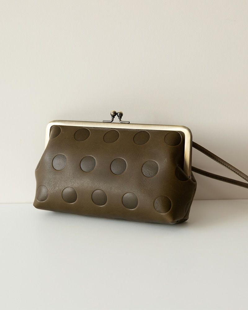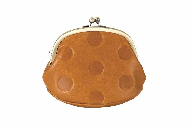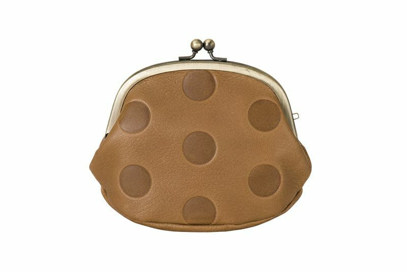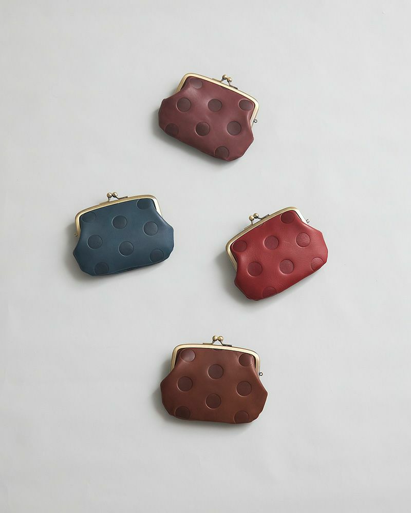 ドットの型押しがポイントのがま口。ふっくら丸みを帯びたフォルムで、どこかレトロな雰囲気が漂います。深さと丸みがあるので、ポーチやアクセサリーケースとして、鞄の中の細々としたものをまとめて収納。お財布としてお使いいただくのにも便利。ポケットに収まるサイズです。