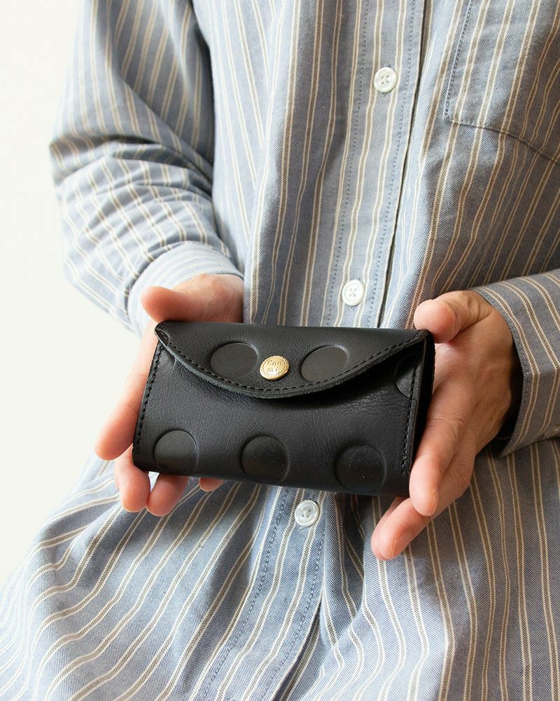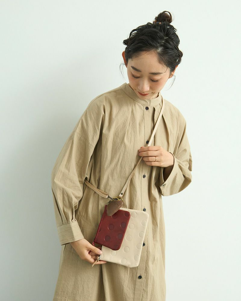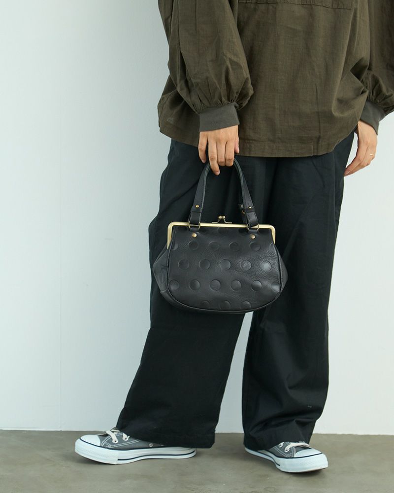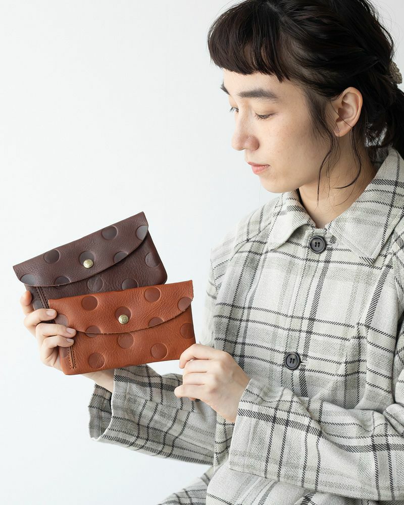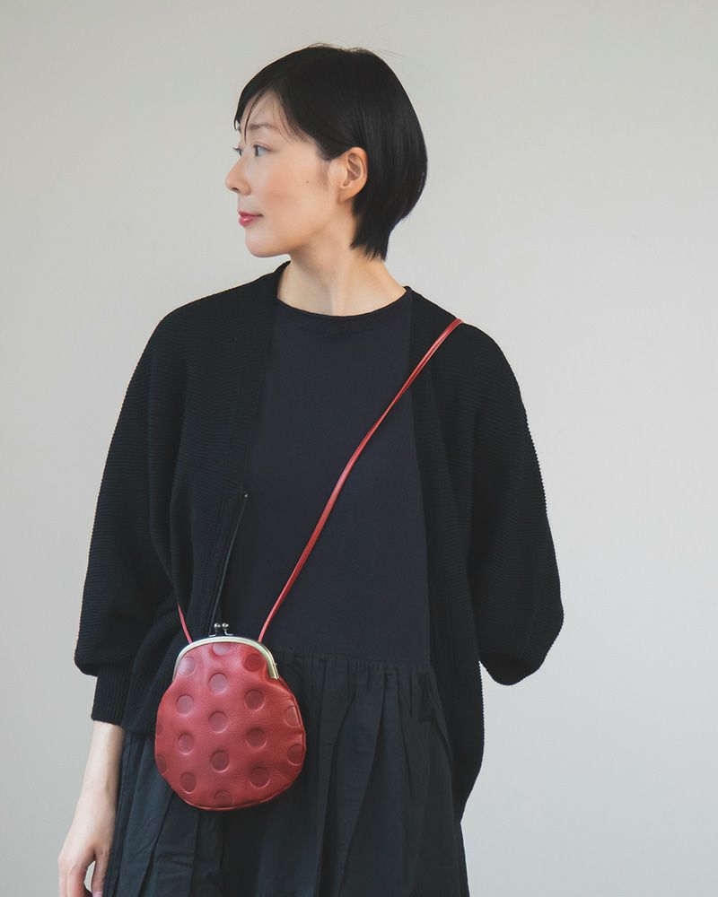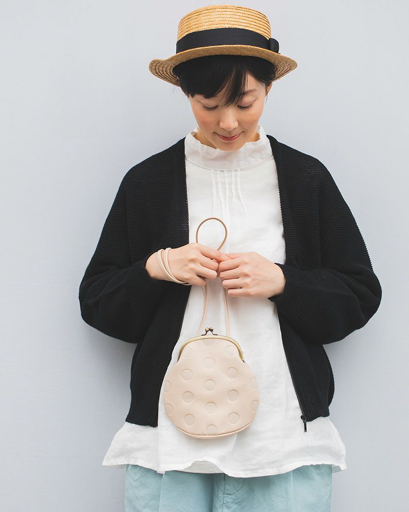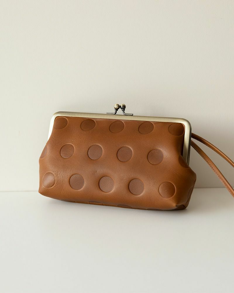 ドットの型押しがポイントのがま口。ふっくら丸みを帯びたフォルムで、どこかレトロな雰囲気が漂います。深さと丸みがあるので、ポーチやアクセサリーケースとして、鞄の中の細々としたものをまとめて収納。お財布としてお使いいただくのにも便利。ポケットに収まるサイズです。