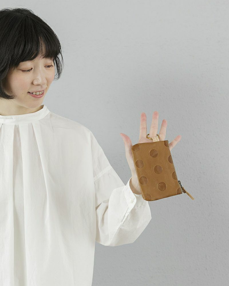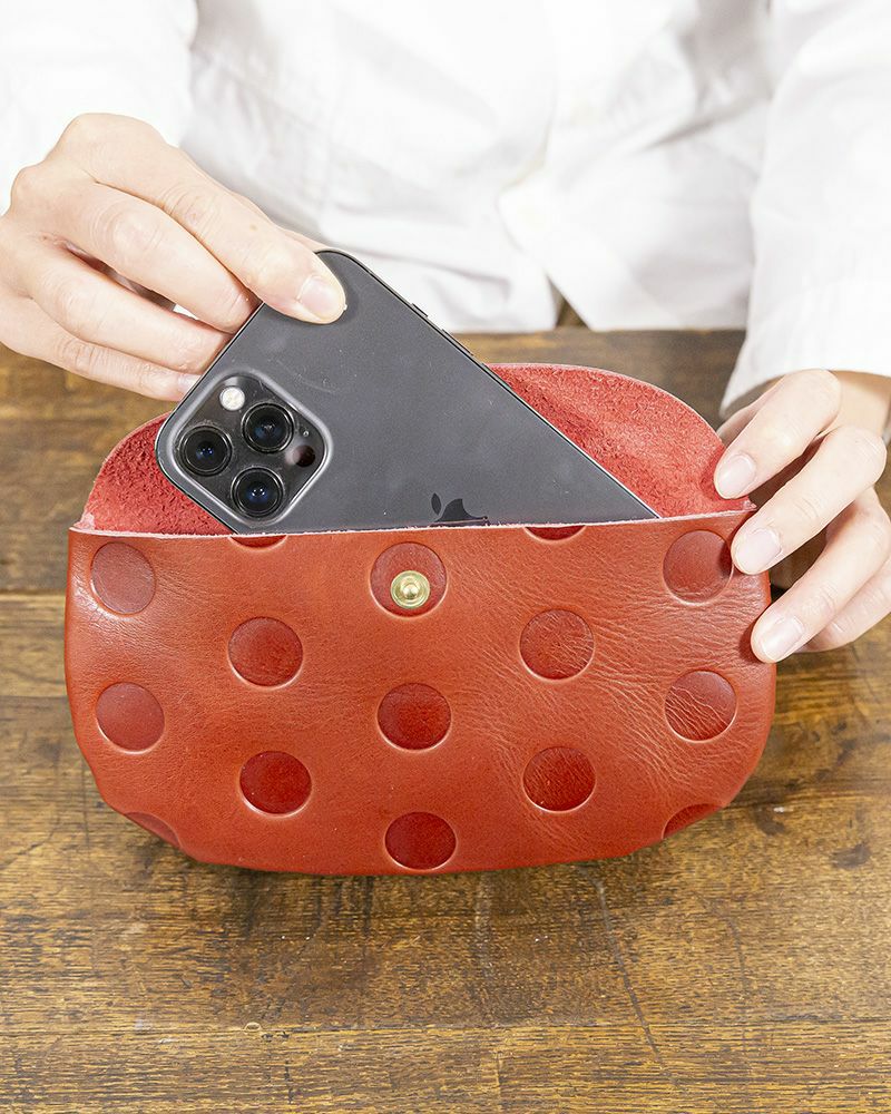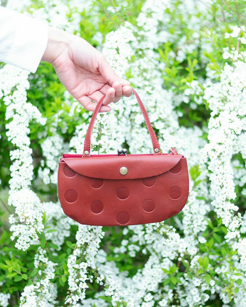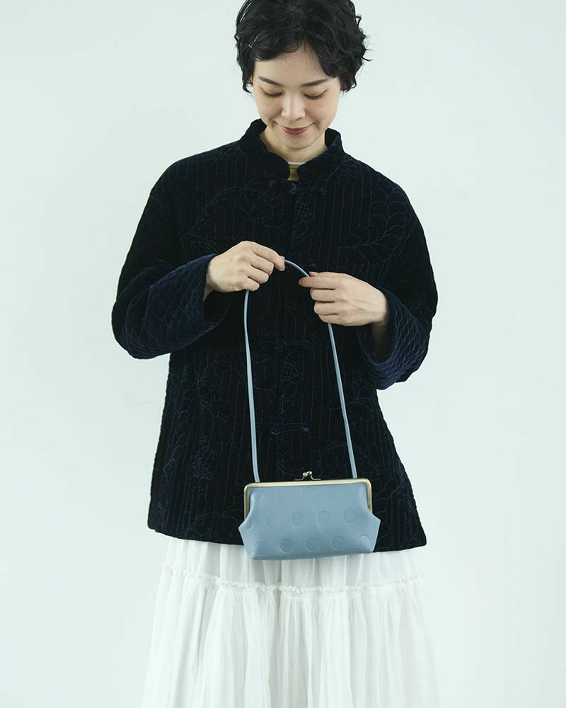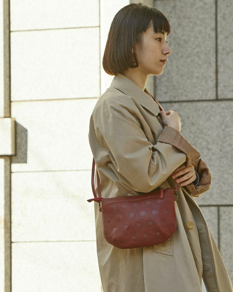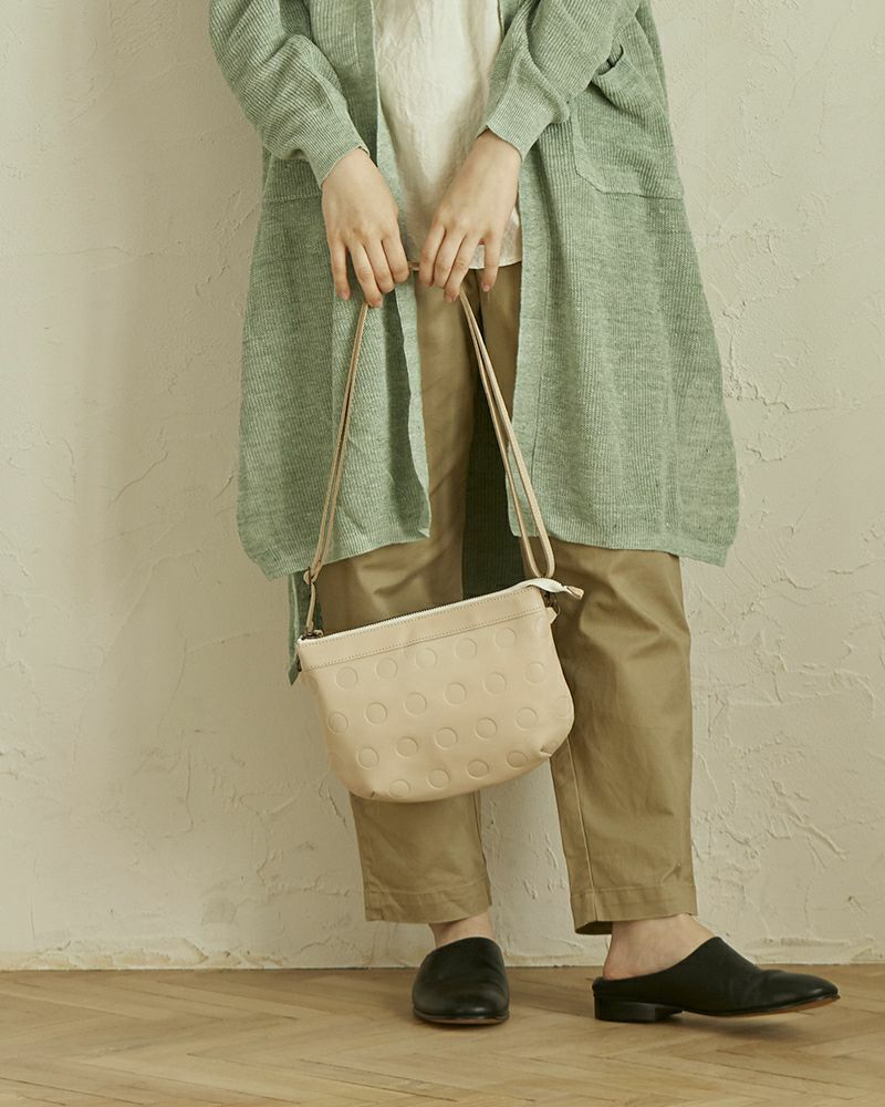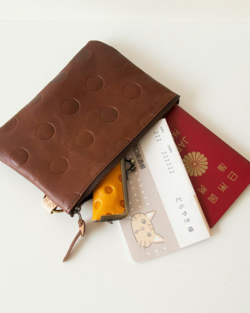 ドットの型押しがポイントのがま口。ふっくら丸みを帯びたフォルムで、どこかレトロな雰囲気が漂います。深さと丸みがあるので、ポーチやアクセサリーケースとして、鞄の中の細々としたものをまとめて収納。お財布としてお使いいただくのにも便利。ポケットに収まるサイズです。