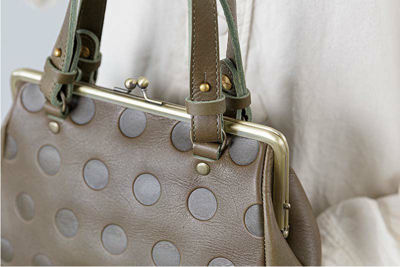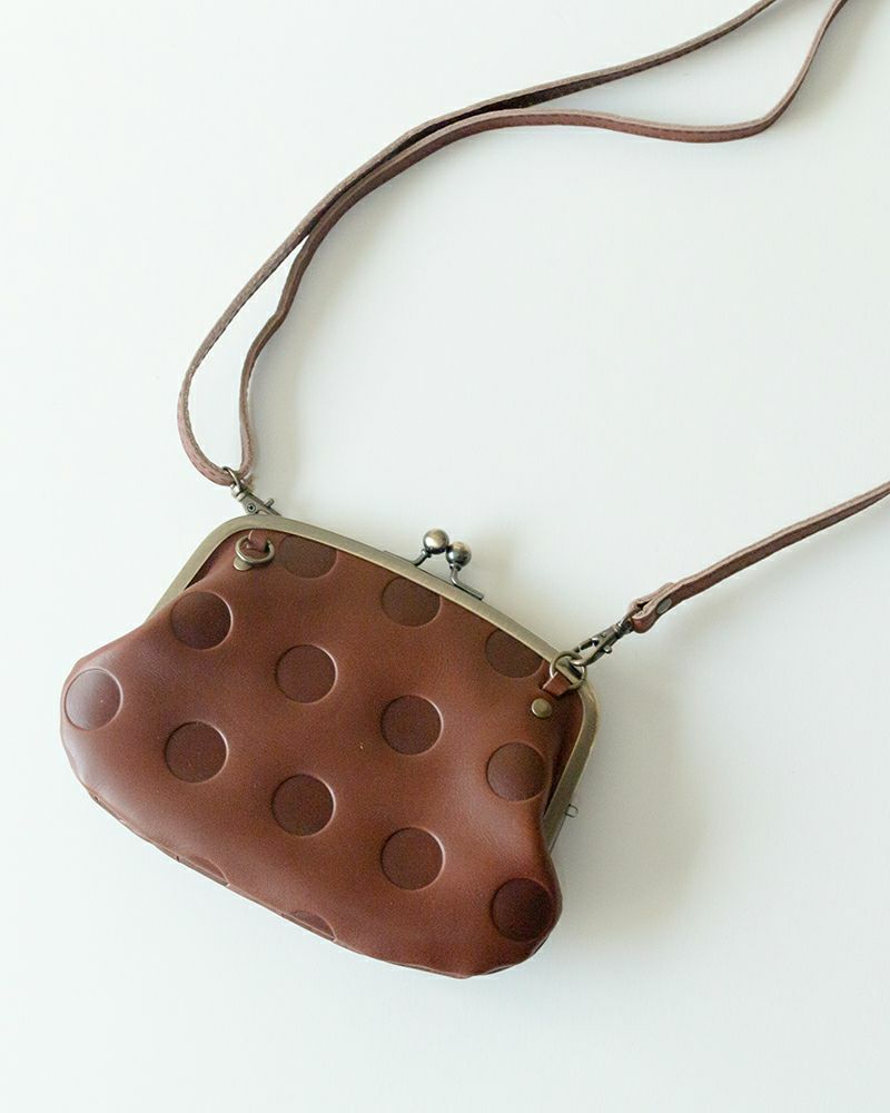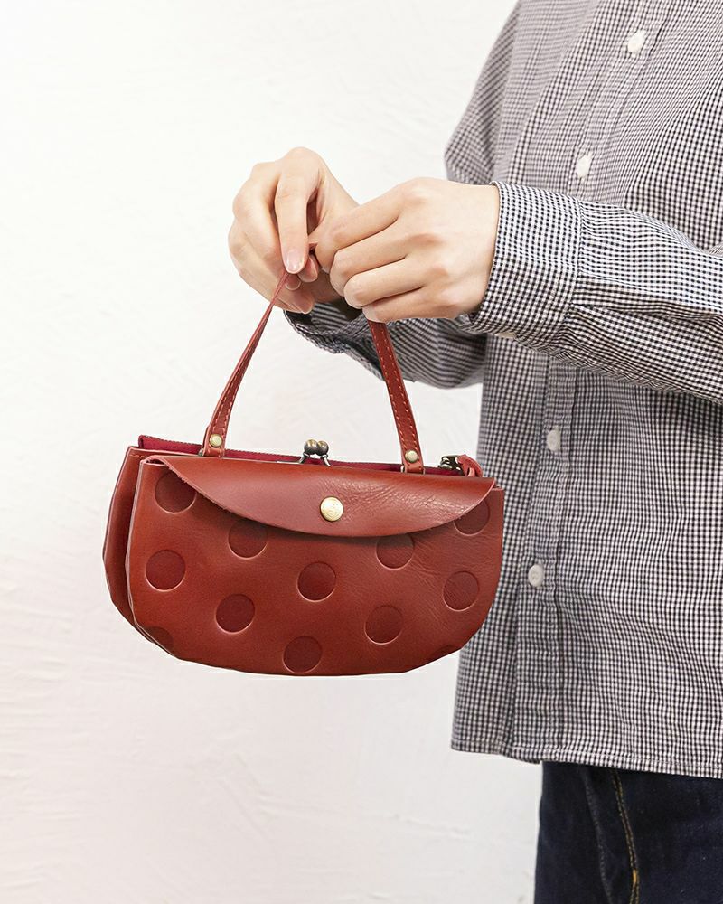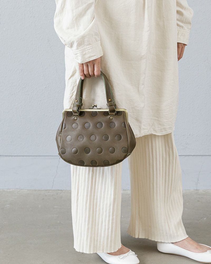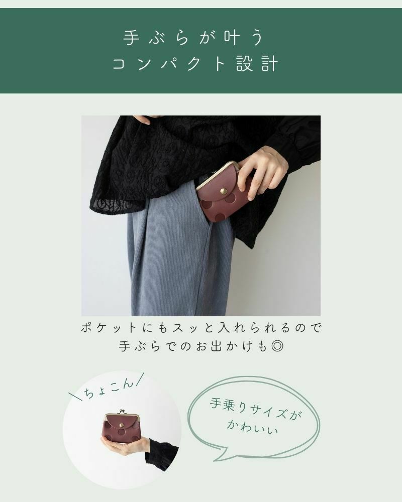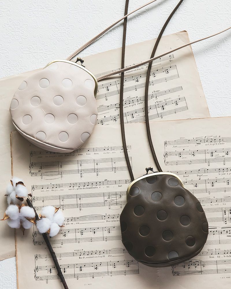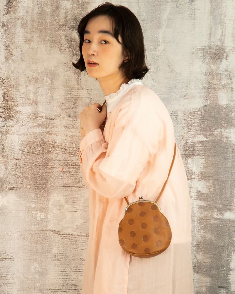たった150gの軽量がま口ポシェット。ちょっとそこまでの時や荷物を最小限にしたい旅先などにぴったり! ナチュラルな風合いの本革とキャンディのような水玉模様が大人可愛いがま口バッグです。