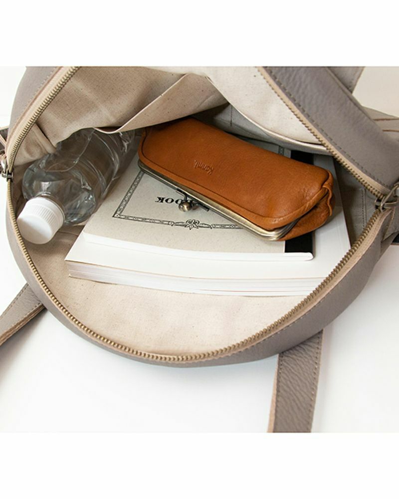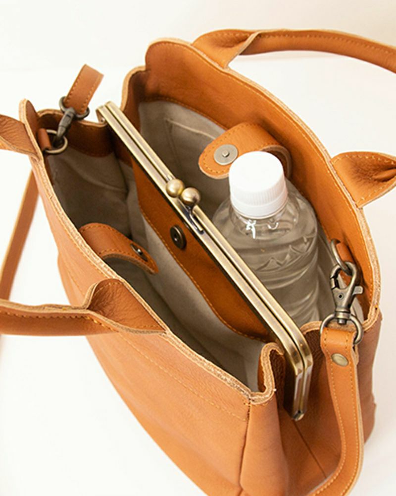 革の艶を楽しめるがま口バッグ。スマホ、ロングウォレット、500mlペットボトル、ハンカチなど必要ばものが全てが入るすぐれものです。お出かけの必需品がしっかりとはいるお休みの日の友達とのカフェ巡りやちょっとおめかししたい日にも、いろいろなシーンで活躍出来そうです。