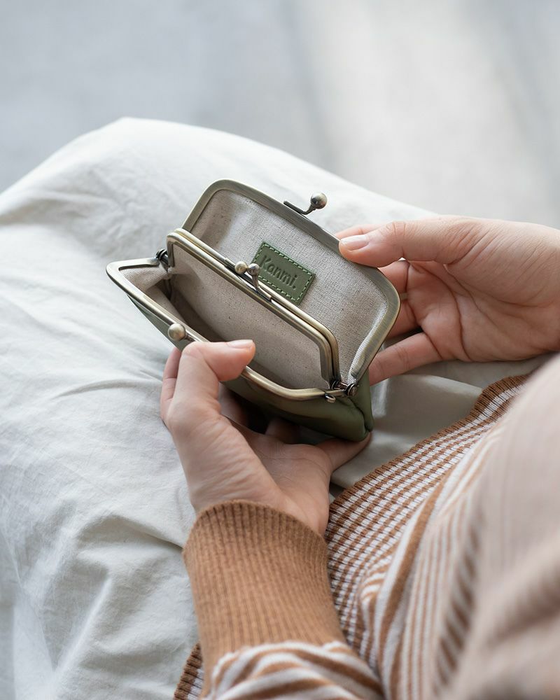 持ち手付きで小さなバッグのような頼れるがま口のお財布。真ん中のがま口が90度近く開くから、中が全部見通せるのがうれしいポイント。 前後のポケットにはそれぞれ、お札やカード、通帳に印鑑、スマホや薄手のエコバッグなどを入れられて、これ一つで身軽なお出かけが叶います。