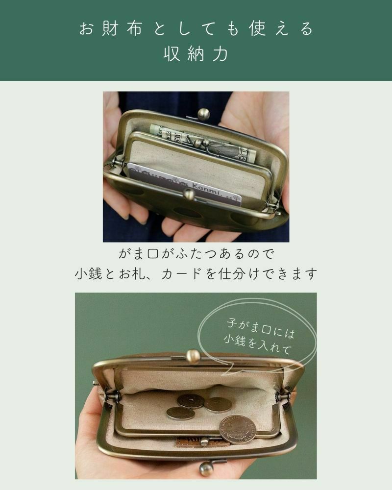 整理整頓上手な親子がま口タイプのお財布。90度ほど開くがま口がふたつ。開けるとコインやカードが一目瞭然です。 レジでももたつかずにお支払いできるから、日々の買い物もスムーズに!