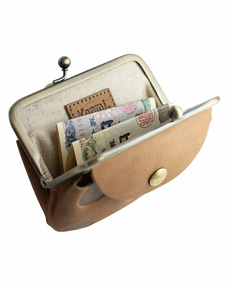 まるくて四角いお財布をあけると、中身はじゃばら式。見た目よりもずっと大容量なお財布です。桜の木で作ったがま口のつまみがユニークな可愛さ。