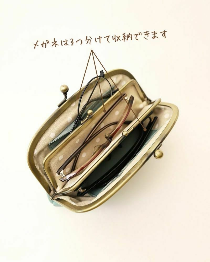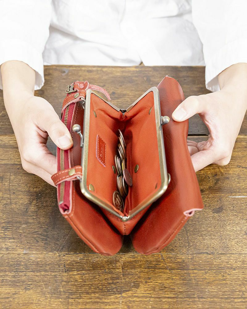 大きいがま口と小さいがま口がセットになった、がま口長財布。カードなどが入るポケットが外側に一つついているから、ICカードや定期などを入れるとそのままタッチできて便利です。