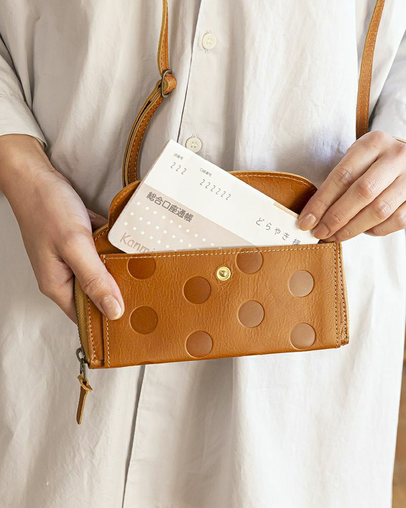 ちょっとそこまでの時や荷物を最小限にしたい旅先などにぴったり! ナチュラルレザーとキャンディのような水玉模様が大人可愛いがま口ポシェットに。 ちょっとそこまでに大活躍「キャンディ トラベル がま口ポシェット」