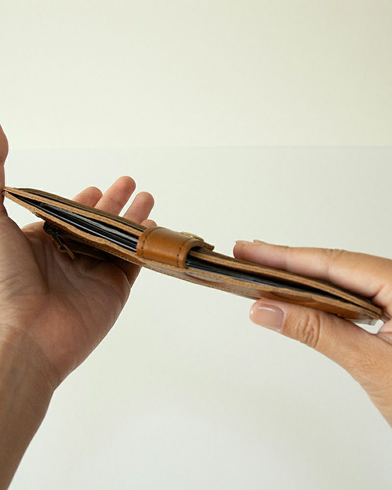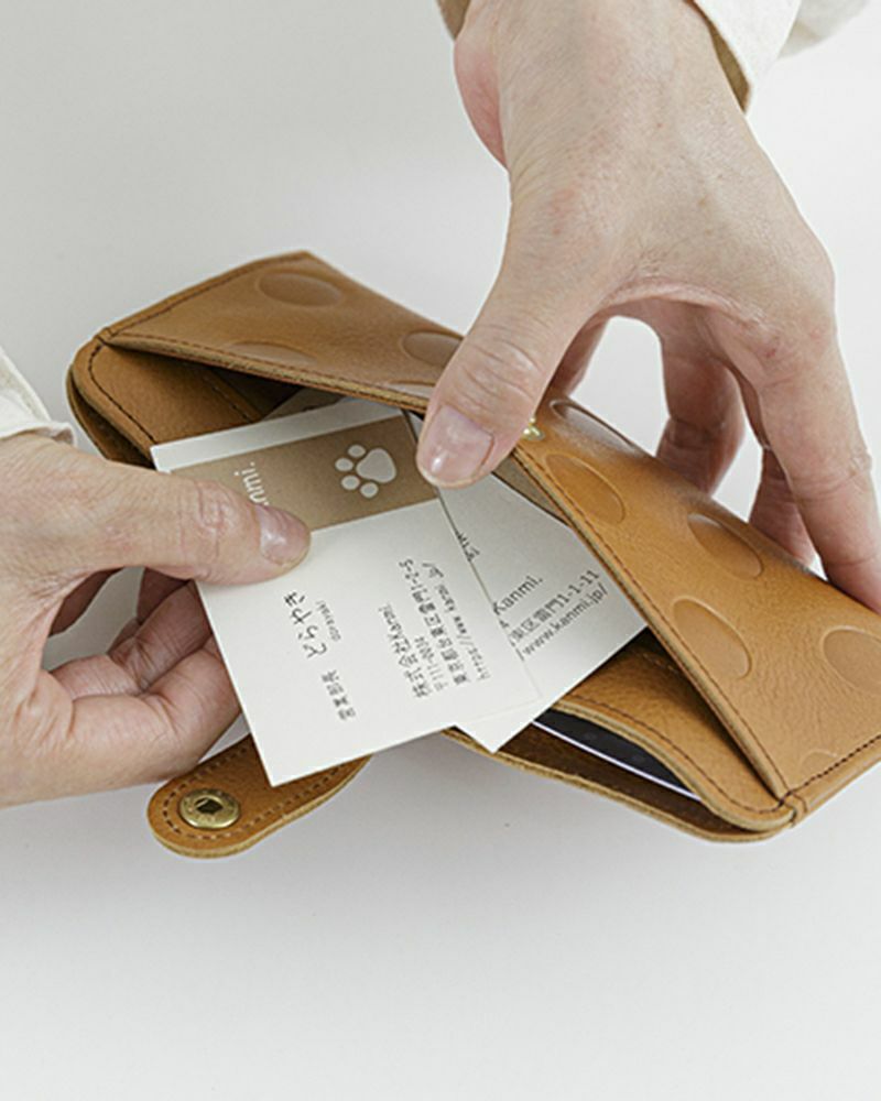 ポケットや小さめバッグに収まる、身軽なお財布。手にすっぽりおさまる薄さとサイズ感。カードポケットは6つ付いて、意外と収納上手なんです。お札は二つ折りでぴったり入ります。