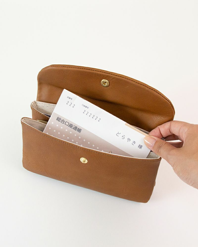 通帳も入る、薄型長財布。バッグの中でも幅をとらず、小さめバッグがパンパンになりません。 薄いのでリュックの背面ポケットにもスッキリ収納することができます。