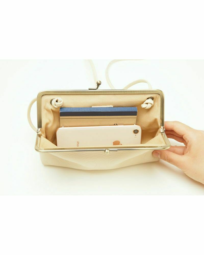 スマホショルダーとして、ちょっとしたお出かけのときはいつもいっしょに。また旅行の時などにバッグインバッグとして鍵や現金などの大切なものを入れておくのにもいいサイズのがま口ポシェットです。